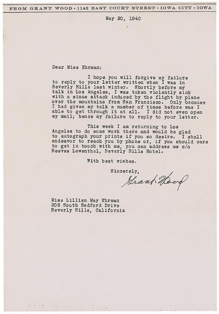 Renowned American artist (1891-1942), one of the principal figures of the Regionalist movement of the 1930s and 1940s, whose painting 'American Gothic' takes a place among the most recognizable icons in the history of American culture. TLS, one page, 7.25 x 10.5, personal letterhead, May 20, 1940. Apologetic letter to an admirer, in part: "I hope you will forgive my failure to reply to your letter?Shortly before my talk in Los Angeles, I was taken violently sick with a sinus attack induced by the flight by plane over the mountains from San Francisco. Only because I had given my talk a number of times before was I able to get through it at all?This week I am returning to Los Angeles to do some work there and would be glad to autograph your prints." In very good to fine condition, with trimmed edges, light creasing, and a few staple holes to the bottom edge.