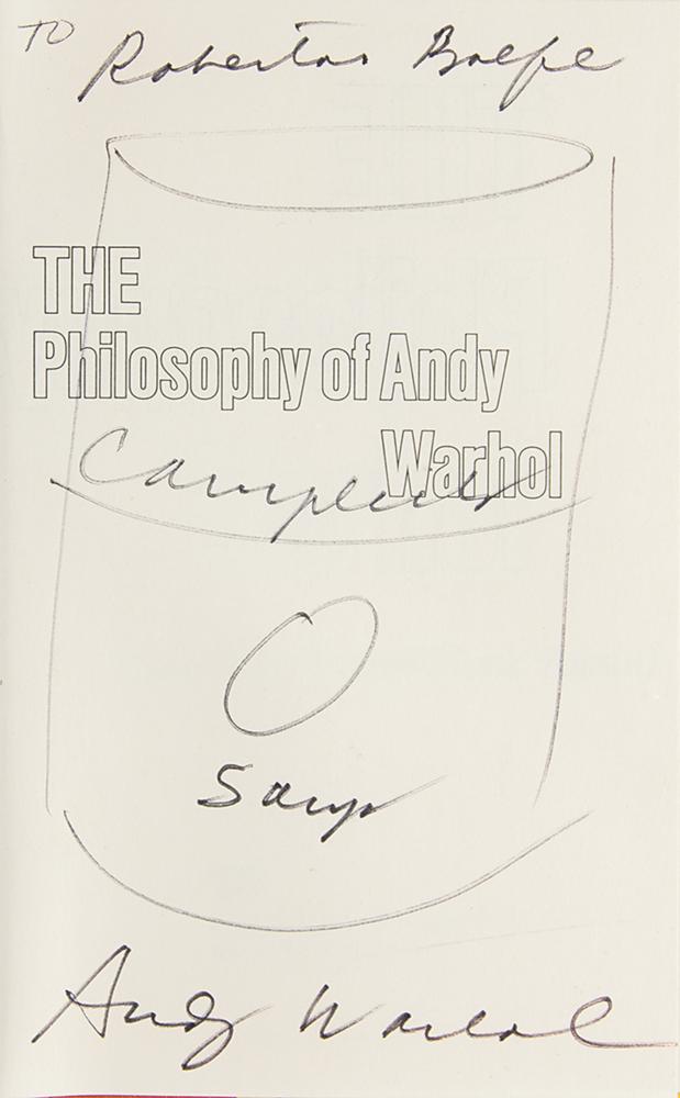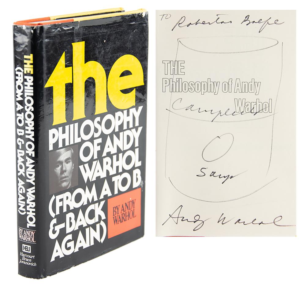 Signed book: The Philosophy of Andy Warhol (From A to B & Back Again). First edition. NY: Harcourt Brace Jovanovich, 1975. Hardcover with dust jacket, 5.75 x 8.5, 241 pages. Signed and inscribed on the first free end page in black felt tip, "To Roberta Balfe, Andy Warhol," with a full-page sketch of his iconic soup can, marked: "Campbell's Soup." In fine condition, with light wear to the unclipped dust jacket, several collector's notations inside, and a bookplate to the front pastedown.