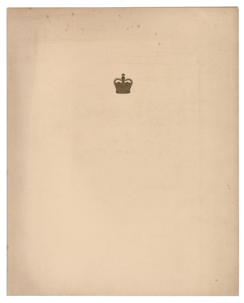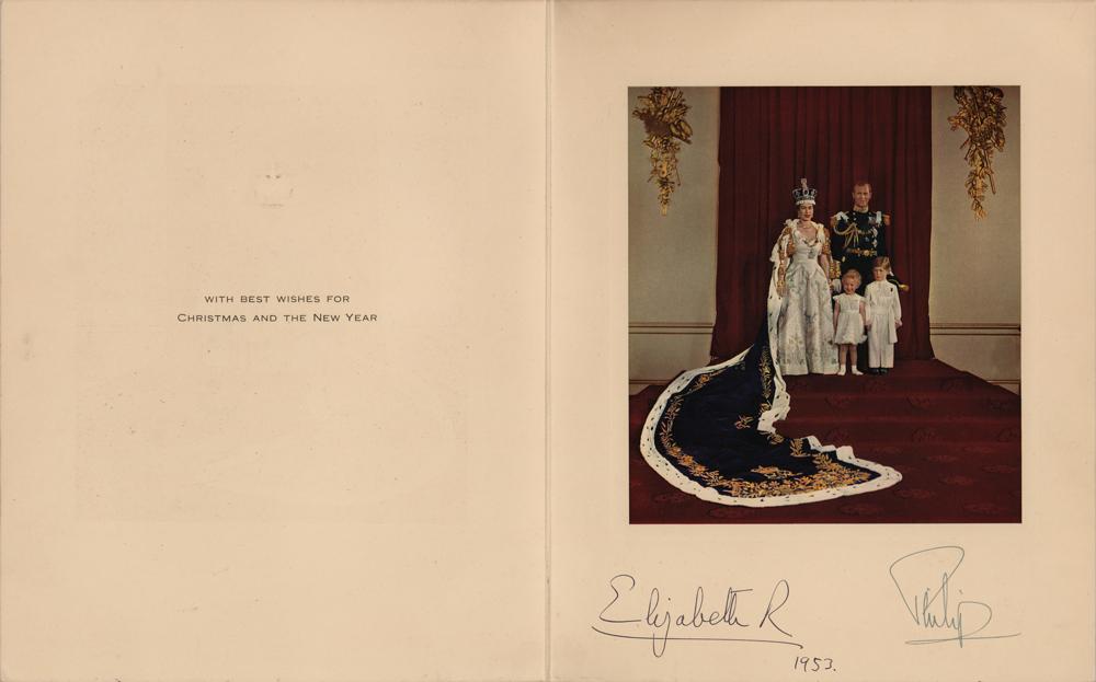 Splendid royal Christmas and New Year's card from 1953 with gilt-embossed crown on the front, measuring 16 x 10 unfolded, featuring a color family portrait of Queen Elizabeth and Prince Philip with their children Charles and Anne, signed below the image in fountain pen, “Elizabeth R, 1953” and “Philip." In fine condition, with some scattered light foxing to the front cover.