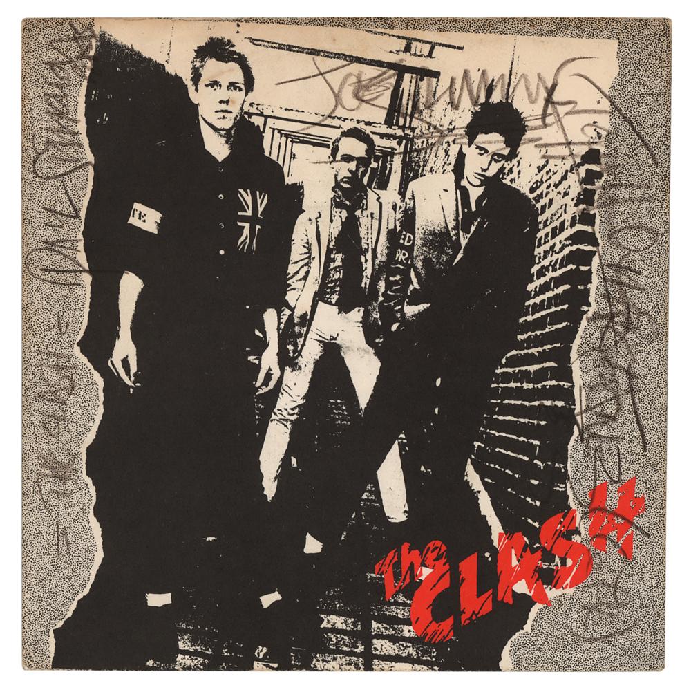 CBS Records UK pressing of the Clash 7″ single ‘Remote Control / London’s Burning,’ signed on the front cover in pencil by Joe Strummer, Mick Jones, Paul Simonon, and Topper Headon. In fine condition, with the Simonon and Headon signatures partially overlapping. The record is included.