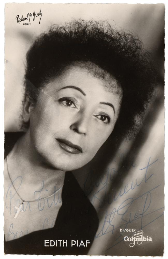 Vintage glossy 3.5 x 5.5 Columbia Records promo photo of Edith Piaf in a close-up pose, signed and inscribed in blue ballpoint. In very good condition, with a surface stain extending from the left edge to her right eye, and the signature and inscription light but legible.