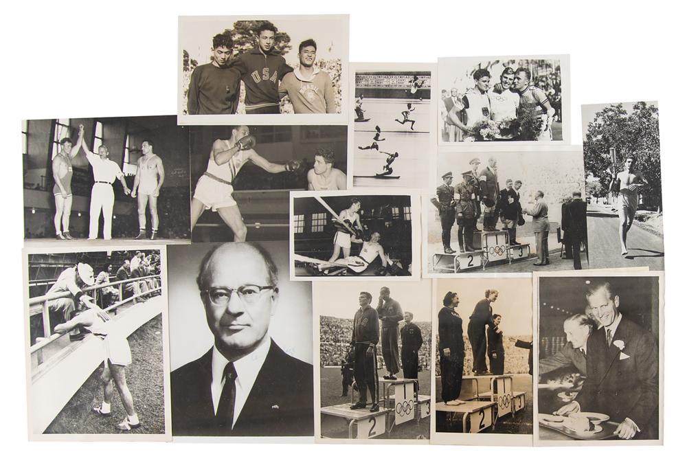 Collection of 99 original vintage glossy press and wire photos portraying the Helsinki 1952 Summer Olympics, ranging in size from 5.5 x 4 to 8 x 10, nearly all stamped or captioned on the reverse. Among the wide variety of subjects are the opening and closing ceremonies, podium ceremonies, visiting dignitaries (including the King and Queen of Sweden and Prince Philip, Duke of Edinburgh), athletes, and events (including diving, equestrian, cycling, swimming, boxing, rowing, and more). Includes some duplication of images, as well as a glossy 8 x 10 photo of IOC president Avery Brundage, signed in blue ballpoint. In overall fine condition.