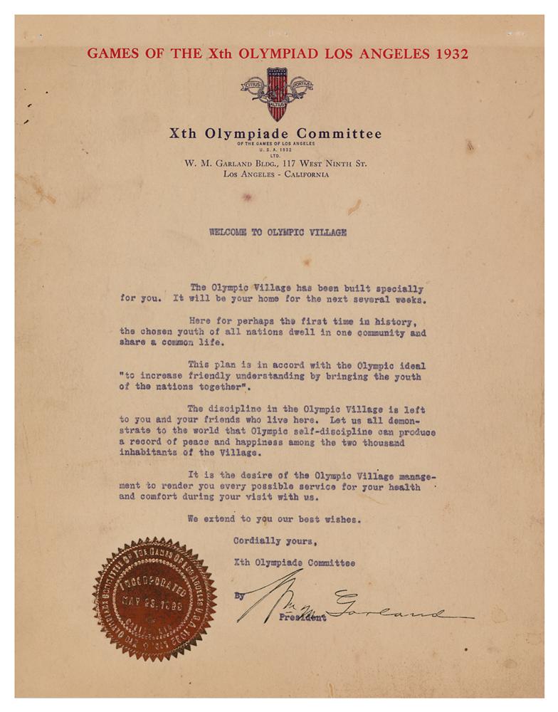 Typed form letter with stamped facsimile signature of William May Garland, president of the Tenth Olympiad Committee, one page, 8.25 x 10.75, Games of the Xth Olympiad Los Angeles 1932 letterhead, no date but circa July 1932. In part: "Welcome to Olympic Village. The Olympic Village has been built specially for you. It will be your home for the next several weeks. Here for perhaps the first time in history, the chosen youth of all nations dwell in one community and share a common life. This plan is in accord with the Olympic ideal 'to increase friendly understanding by bringing the youth of the nations together?Let us all demonstrate to the world that the Olympic self-discipline can produce a record of peace and happiness among the two thousand inhabitants of the village." The gold foil seal affixed to the lower left remains intact. In fine condition, with a few light stains and tack holes to corners.