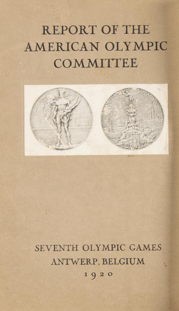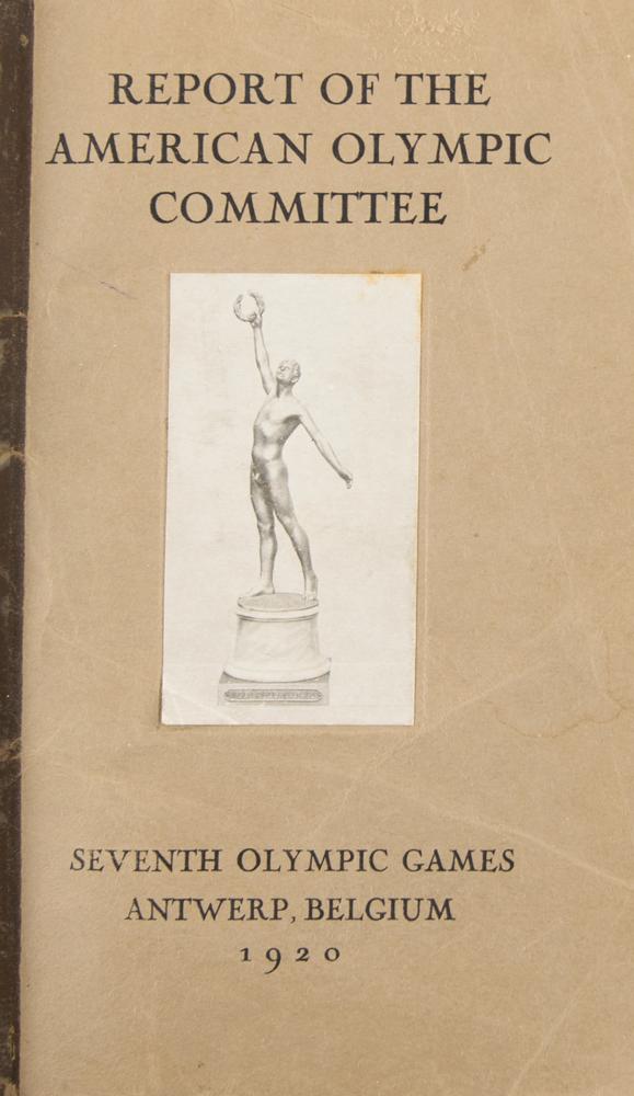 Uncommon custom-bound official report: Report of the American Olympic Committee: Seventh Olympic Games, Antwerp, Belgium, 1920. Greenwich, CT: Conde Nast Press. Custom-bound hardcover in black-and-red cloth with gilt-stamped title on spine, "American Olympic Committee Report 1920," 6 x 9, 451 pages. Original softcover wrappers bound in. In very good to fine condition, with wear and creasing to the original wrappers; interior pages otherwise clean.