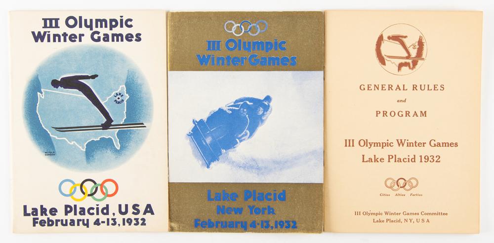 Three preliminary / general programs for the Lake Placid 1932 Winter Olympics: two versions of a general program offering information on the venue, events, and accommodations, one with a cover featuring the logo of a ski jumper soaring over a map of the United States, and the other showing a bobsled rounding a corner; and one "General Rules and Program" booklet, outlining the rules regarding the celebration of the Games and a general schedule of events. In overall very fine condition.