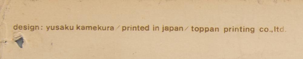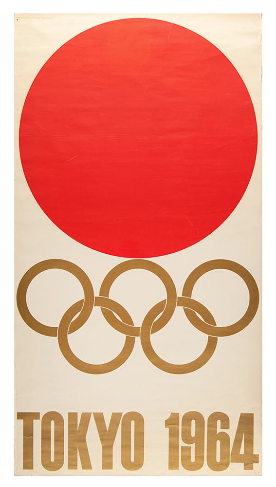Sought-after original color 21.75 x 40.25 poster for the Tokyo 1964 Summer Olympics, featuring the bright red 'rising sun' emblem of the Games over golden Olympic rings and block-letter text: "Tokyo 1964." Printed in tiny lettering in the upper left corner: "design: yusaku kamekura / printed in japan / toppan printing co., ltd." Rolled and in very good condition, with edgewear, scattered creases, a closed tear to top edge, and tack holes to corners. The poster's designer, Yusaku Kamekura, was a leading figure in post-World War II Japanese graphic design.