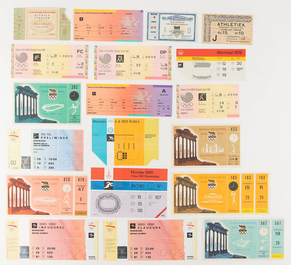 Nice collection of 19 Summer Olympic tickets and ticket stubs, beginning with the Amsterdam 1928 Summer Olympics and ending with the Barcelona 1992 Summer Olympics. Includes: