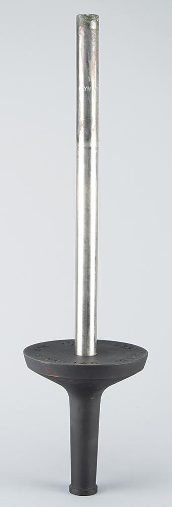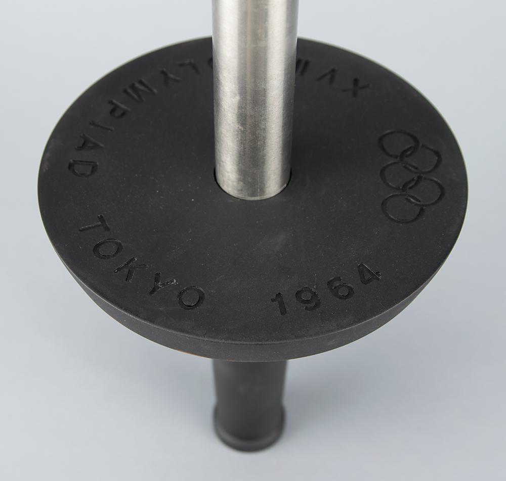 Official 1964 Tokyo Summer Olympics torch, consisting of a blackened aluminum alloy bowl and a stainless steel cylinder, measuring 25.5″ in length and 6.75″ at its widest point. Manufactured by Nippon Light Metal Co., the bowl is engraved "XVII Olympiad Tokyo 1964" with a set of Olympic rings, and underside of handle marked: "Nikkei Yanagi." The lower portion of the cylinder bears the Tokyo Games logo and reads "Showa Kaseihin Co., Ltd., 3-1964," with upper section marked: "Olym[pic Torch]," partially charred and illegible. Exhibits burn marks and wear to the burner cylinder, and a few scattered marks to the easily scuffed black bowl. Complete with the the rarely seen original cardboard boxes for both piece: a long thin box marked "Olympic Torch" for the burner tube, and a cube-shaped box with the Tokyo 1964 emblem for the torch holder.