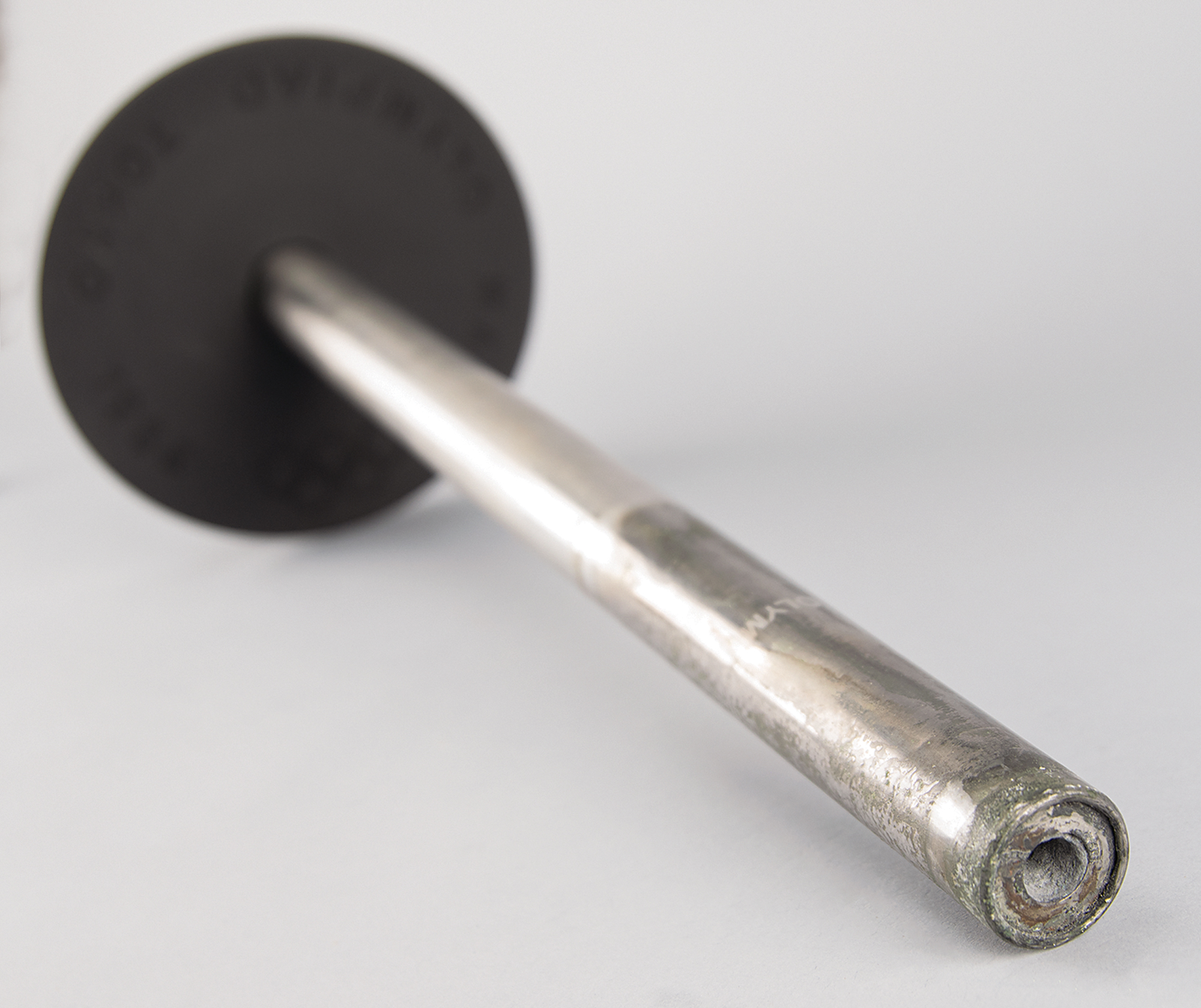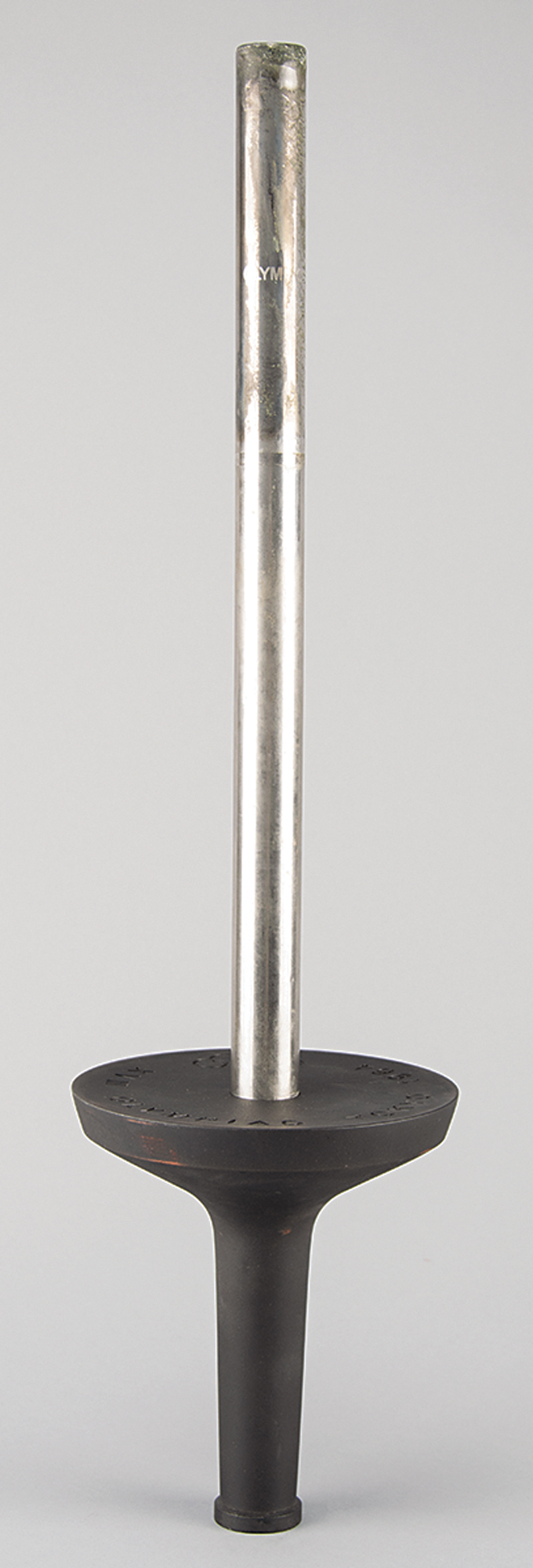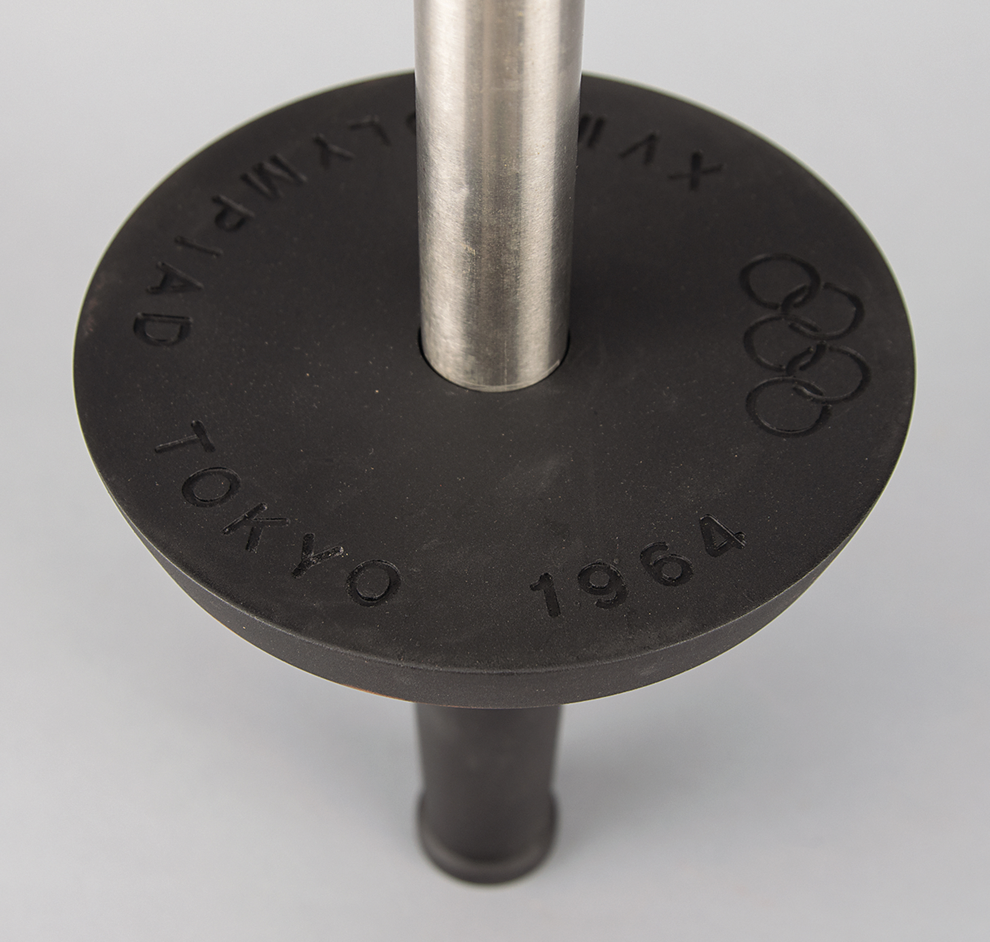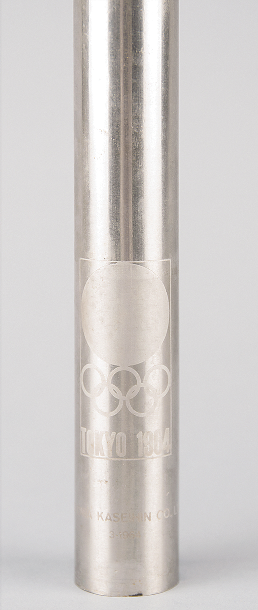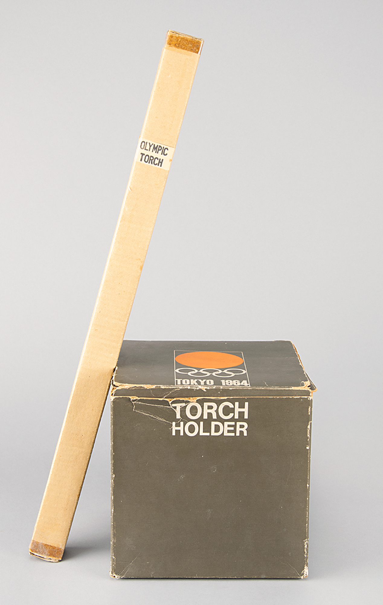 Official 1964 Tokyo Summer Olympics torch, consisting of a blackened aluminum alloy bowl and a stainless steel cylinder, measuring 25.5″ in length and 6.75″ at its widest point. Manufactured by Nippon Light Metal Co., the bowl is engraved "XVII Olympiad Tokyo 1964" with a set of Olympic rings, and underside of handle marked: "Nikkei Yanagi." The lower portion of the cylinder bears the Tokyo Games logo and reads "Showa Kaseihin Co., Ltd., 3-1964," with upper section marked: "Olym[pic Torch]," partially charred and illegible. Exhibits burn marks and wear to the burner cylinder, and a few scattered marks to the easily scuffed black bowl. Complete with the the rarely seen original cardboard boxes for both piece: a long thin box marked "Olympic Torch" for the burner tube, and a cube-shaped box with the Tokyo 1964 emblem for the torch holder.