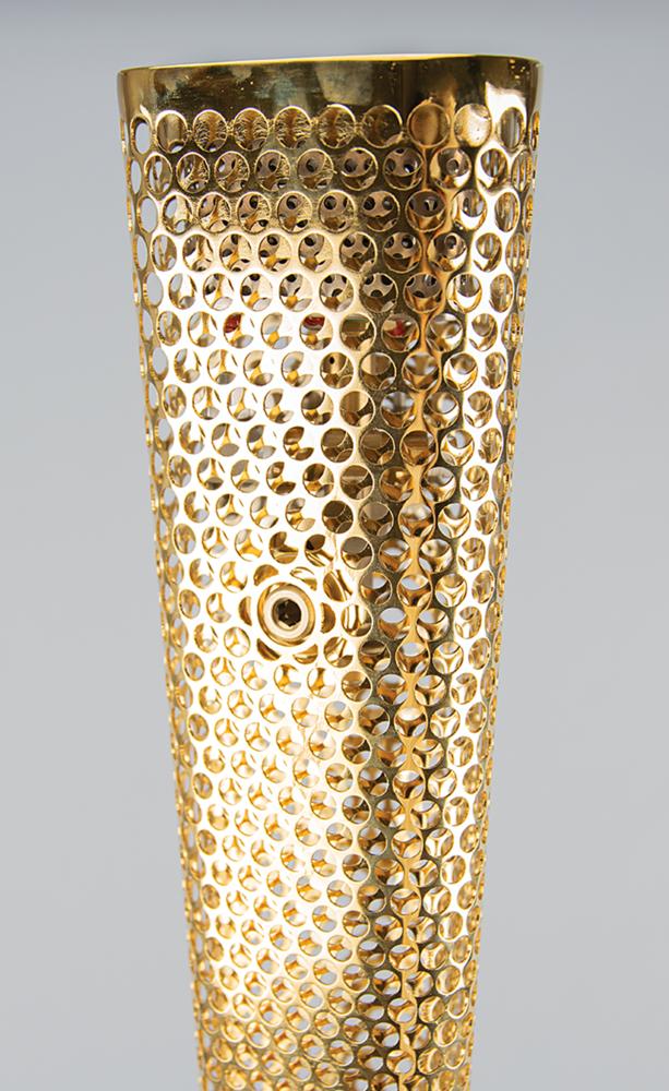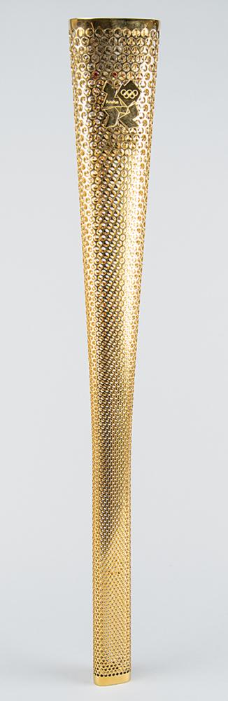 Sought-after unused official 2012 London Olympics torch, comprised of metal and aluminum, measuring 31.5″ in length and 4.25″ at its widest point, designed by Edward Barber and Jay Osgerby, and manufactured in collaboration by Tecosim, LPG Gas, Bullfinch and Premier Sheet Metal. The gold-colored torch body consists of two envelopes of aluminum alloy perforated with 8,000 circles, a number which matches with both the amount of torchbearers and the United Kingdom relay miles, and features a golden metal logo of the Games near the top. The triangular shape refers to the multiples of three found in the Olympic movement’s values of excellence, friendship, and respect, the Olympic motto of ‘Citius, Altius, Fortius,’ and London’s hosting of the Games for the third time.