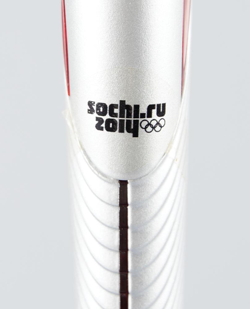 The Olympic flame was lit in Olympia, Greece, on September 13, 2013, and made its way onto Russian soil on October 7, traveling through all eighty-three regions of the Russian Federation during its five-month and 65,000 km relay. Additionally, other specially designed Sochi torches reached the North Pole, the summit of Mount Elbrus, submerged thirteen meters into Lake Baikal, and another even entered outer space, with cosmonauts Oleg Kotov and Sergei Rayazansky passing the torch outside the International Space Station. Inspired by the feather that bestows good luck in its purest form upon its bearer, this is a wonderful and uniquely designed torch.
