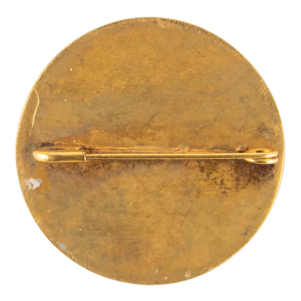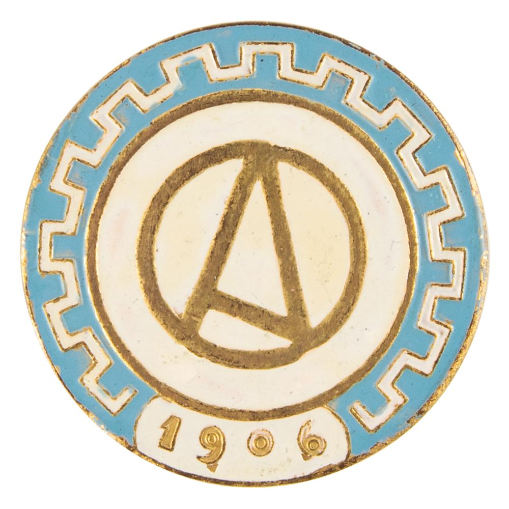Rare athlete's badge issued for the Athens 1906 Intercalated Summer Olympics. Gilt bronze, 36 mm in diameter, featuring an enameled light blue ancient Greek motif in the border, with white enamel circular center surrounding the gilt "A." Mounted with a golden safety pin on the reverse. The 1906 Games in Athens were considered the Olympics by the press and participants, which included 854 athletes from twenty countries. As they were never officially sanctioned by the International Olympic Committee, they are given the 'Intercalated' nomenclature today.