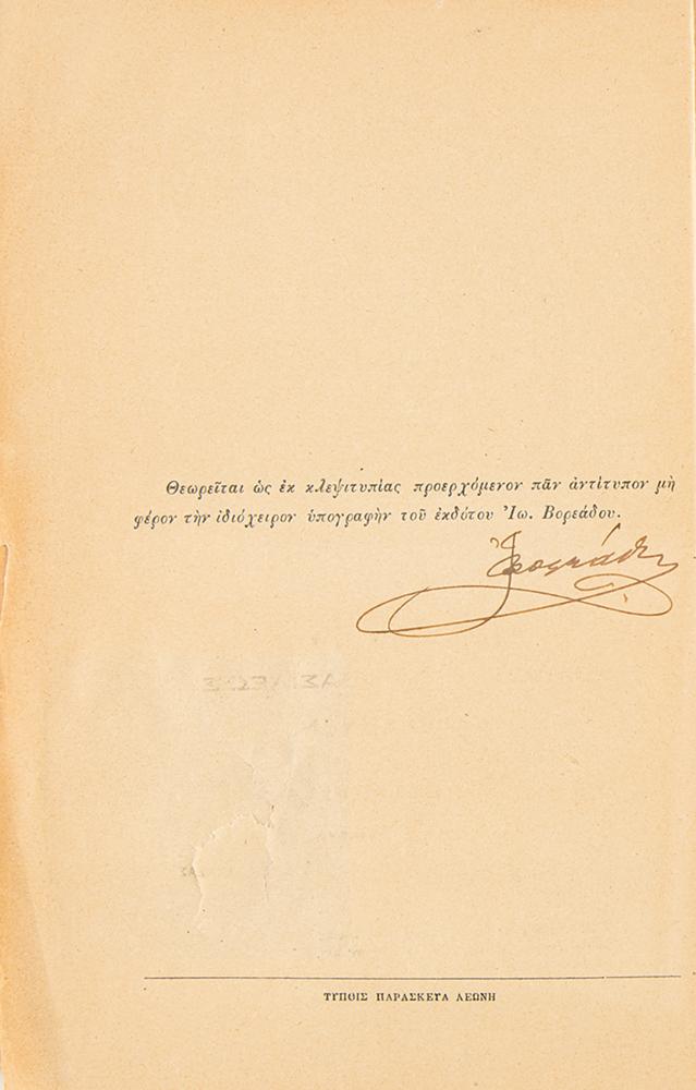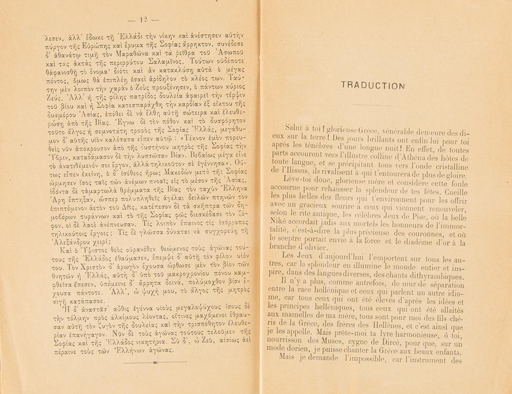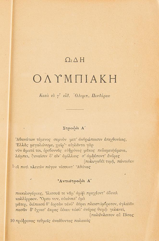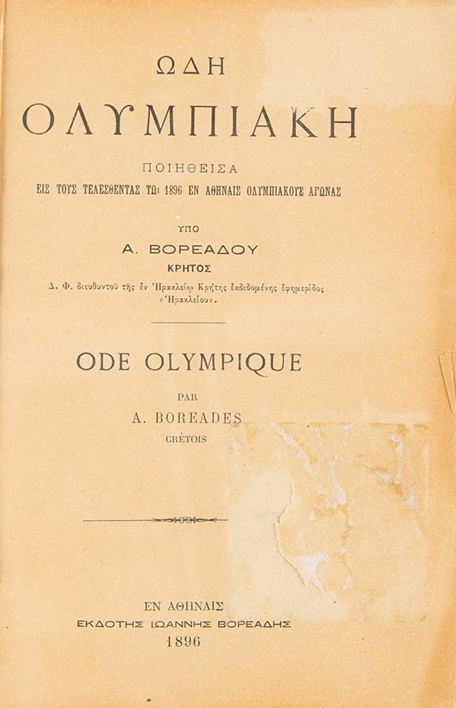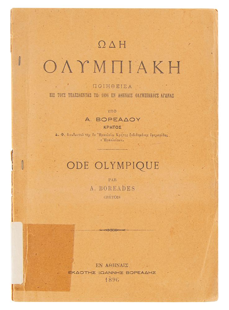 Rare staple-bound bilingual booklet entitled "Olympic Ode," published in Athens in 1896 by A. Boreades, 16 pages, 6 x 8.5, offering the text (in Greek and French) of the Pindaric Ode recited for the first Modern Olympic Games. Certified inside with the publisher's ink signature. In good to very good condition, with tape repair to spine/covers, surface loss to title page, and minor edge chipping.
