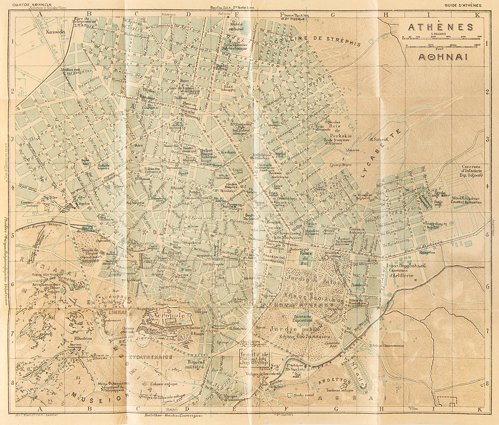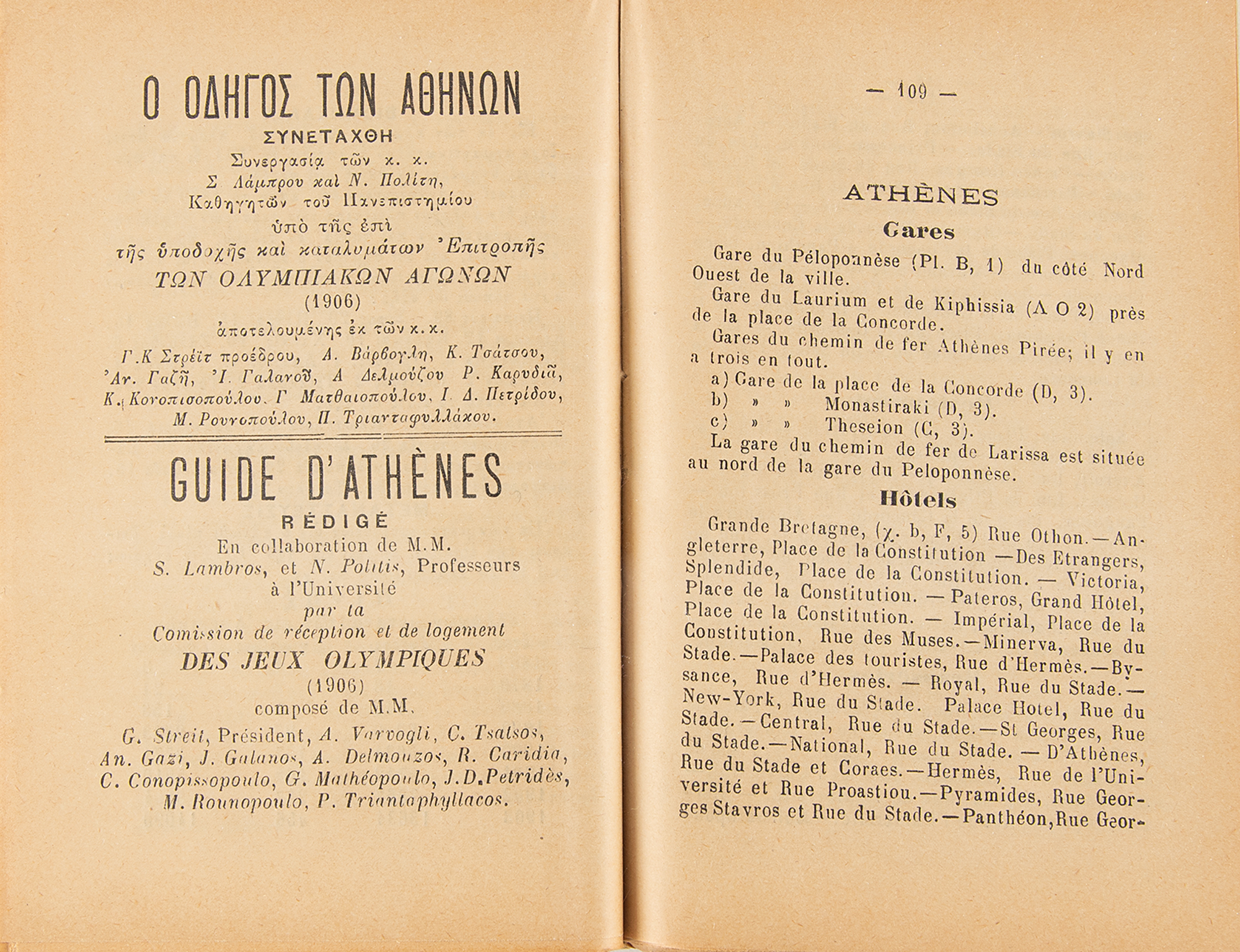 Rare official softcover "Guide to Athens" in Greek and French, published by the Olympic Organizing Committee for the 1906 Intercalated Olympic Games, 218 numbered pages plus 20 pages of advertisements, 4.25 x 6.25, published by P. Leonis. Includes a highly detailed fold-out map of the city, plus detailed information for travelers, such as listings of accommodations, attractions, and amenities; pictures of landmarks; and ads for Athens businesses. A ticket stub for an "Operetta" remains loosely laid in from that time. In very good condition, with light soiling to covers and overall wear from use.