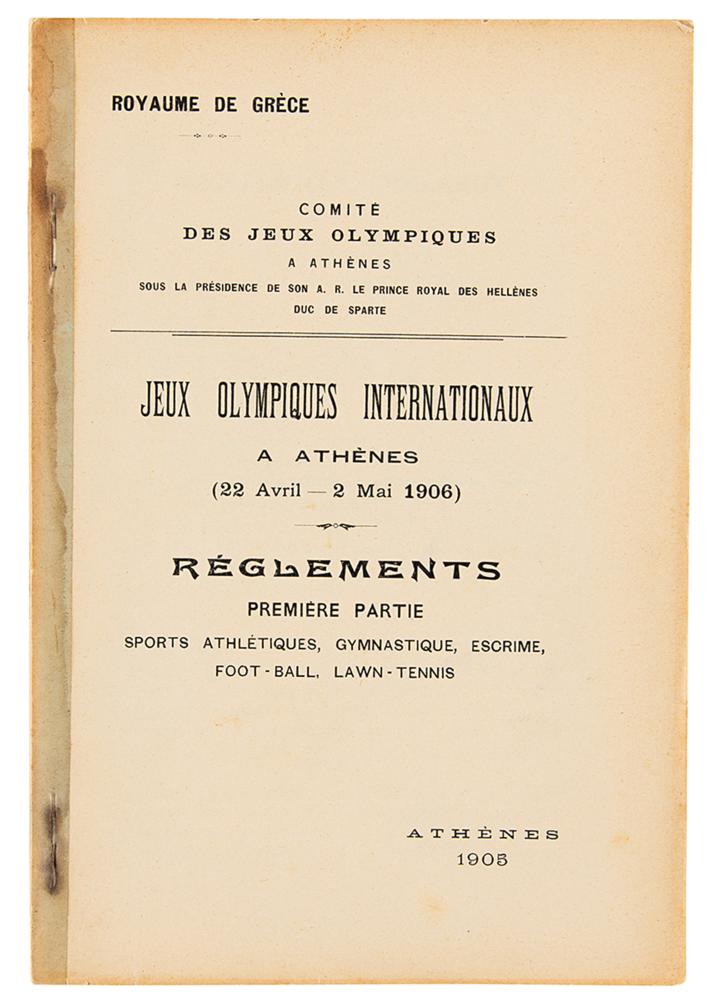Uncommon French-language official regulation booklet for several events held as part of the Athens 1906 Intercalated Olympics, 66 pages, 5.5 x 8.25, published by the Olympic Committee in Athens in 1905. Includes the official regulations for athletic sports, gymnastics, fencing, football, and lawn-tennis. In very good to fine condition, with light staining to spine and a small tear to right edge.