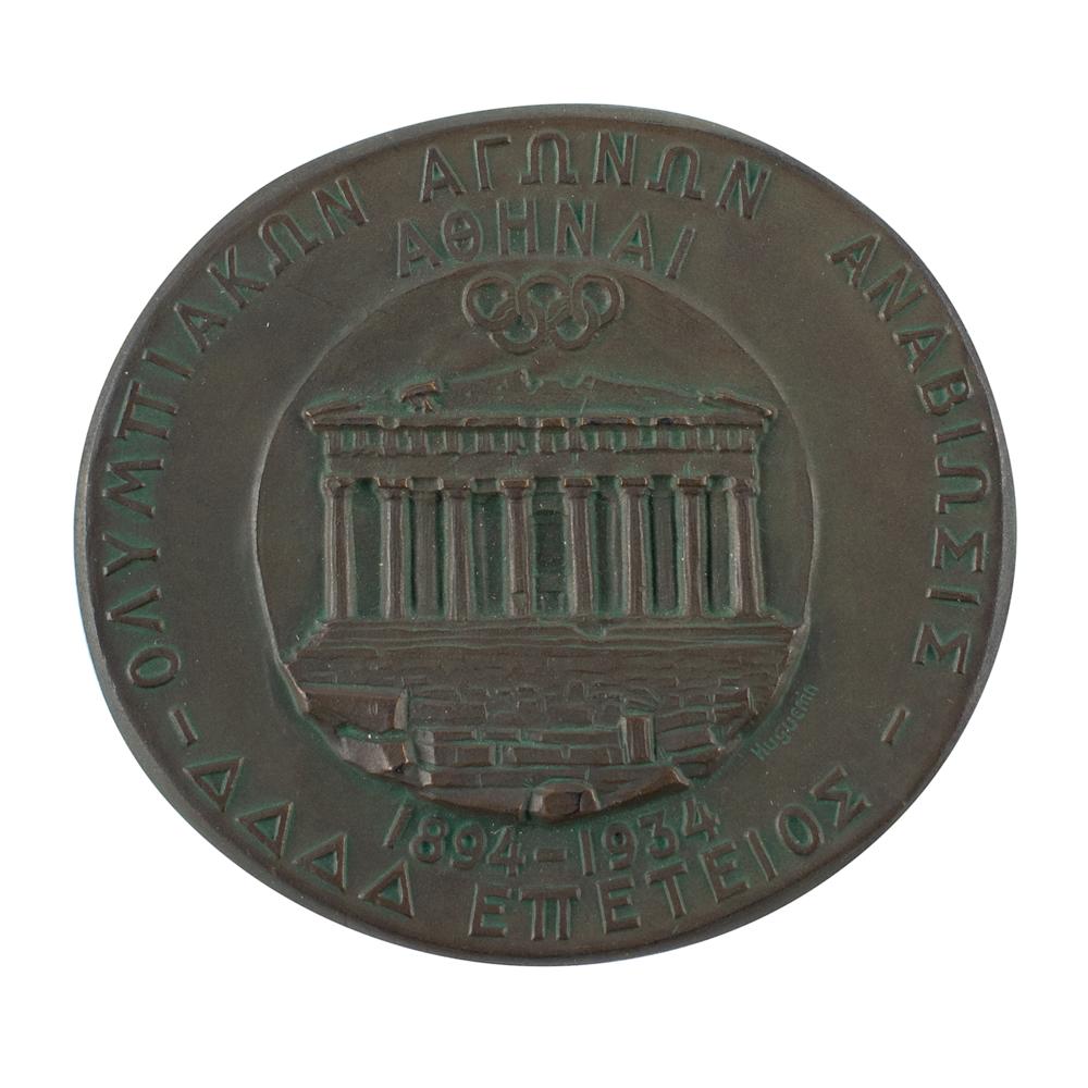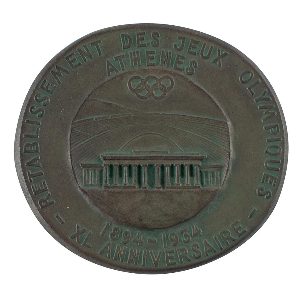 Commemorative medal issued in 1934 to celebrate the 40th anniversary of the revival of the modern Olympics at Athens. Bronze, 67 mm x 60 mm, 141 gm, by Huguenin Freres & Co. Both sides depict Grecian landmarks, encircled by bilingual text in Greek and French: "Retabblissement des Jeux Olympiades, Athenes, 1894-1934, XL Anniversaire." Complete with its original case. In 1894, Pierre de Coubertin organized a congress that created the modern Olympics, established the IOC, and chose Athens as the first host site for the revived Games.