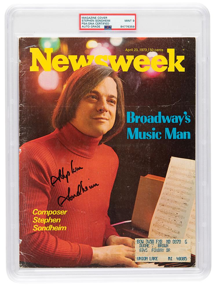 Cover from the Newsweek Magazine of April 23, 1973, featuring a story on "Broadway's Music Man," 8.25 x 10.75, signed in black felt tip, "Stephen Sondheim." In very good to fine condition, with scuffing, creasing, and intersecting mailing folds. Encapsulated and graded by PSA/DNA as "MINT 9."