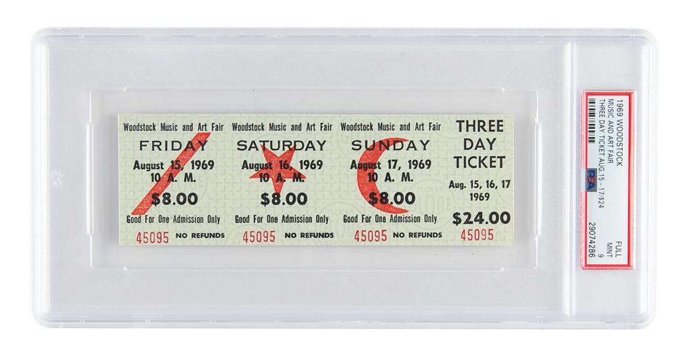Graded by PSA MINT 9. Original unused three-day admission ticket for the iconic Woodstock Music and Art Fair, 6 x 2, issued for August 15-17, 1969, numbered "45095."
