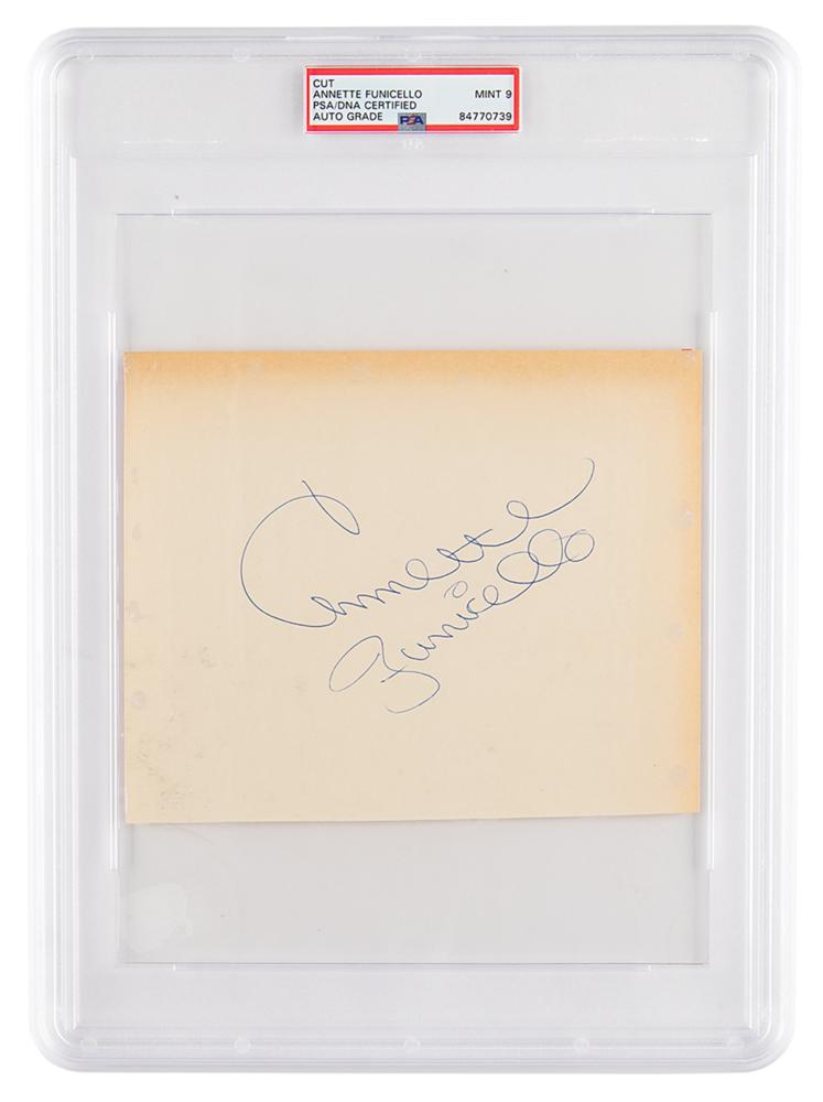 Vintage ballpoint signature, "Annette Funicello,” on an off-white 7.25 x 6 sheet. In fine condition, with faint edge toning. Encapsulated and graded by PSA/DNA as "MINT 9."