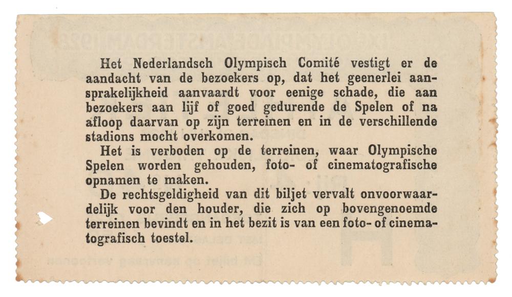 Official Dutch-language admittance ticket for the Amsterdam 1928 Summer Olympics, 4.25 x 2.5, for July 31, 1928, issued for the ‘South Stands,’ ‘Row 4’ and ‘No. 46,’ with bold text identifying the sport as “Athletiek” or Athletics. The lower right has been hole-punched. In fine condition. Two world records were set on this date when South Africa’s George Weightman-Smith reached a speed of 14.6 in the 110-meter hurdles and Poland’s Halina Konopacka set a new discus throw record with a toss of 39.62 meters.
