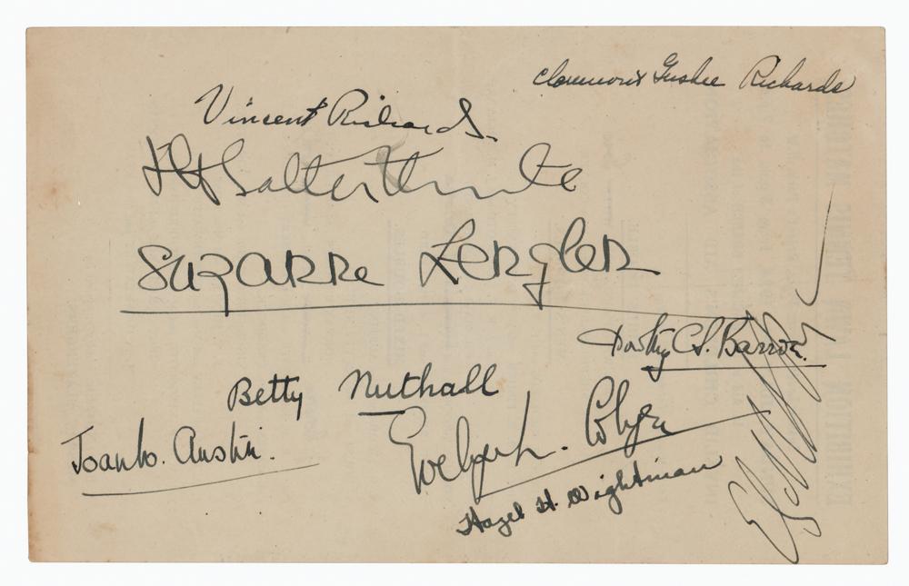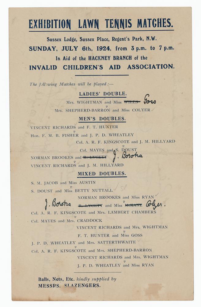 Uncommon handbill headed "Exhibition Lawn Tennis Matches," held at Regent's Park, London, on July 6, 1924, one page, 5 x 8, signed on the reverse in fountain pen by several tennis stars, including: Vincent Richards (and his wife Claremont), Suzanne Lenglen, Dorothy Shepherd-Barron, Evelyn L. Colyer, Hazel Hotchkiss Wightman, Phyllis Satterthwaite, Betty Nuthall, Joan Austin, and Elizabeth Ryan. Encapsulated in Mylar and in fine condition. Accompanied by two modern photo prints: one of Wightman and one of Richards. Autographs of both Lenglen and Colyer are considerably scarce.