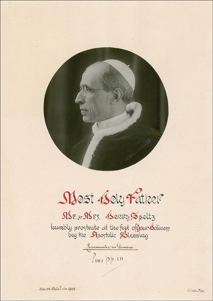 Pope, born Eugenio Maria Giuseppe Giovanni Pacello (1876-1958), who reigned from 1939 until his death. During WWII he advanced several peace proposals, did much to aid war victims, and, following the war, maintained a staunch anti-Communist stand. Apostolic blessing, signed "Pius pp. XII," one page, 10.75 x 15.25, October 14, 1949. A handsome, hand-tinted apostolic blessing for Mr. and Mrs. Barry Spelts, featuring an ornate and illuminated calligraphic inscription and an affixed circular photo of Pius. In fine condition.