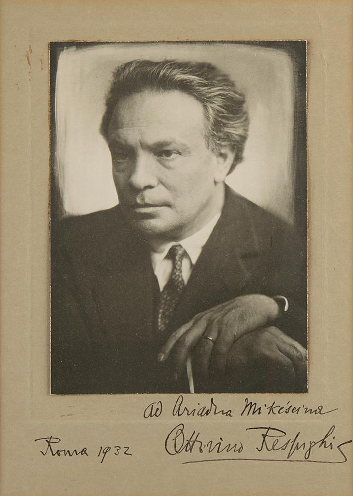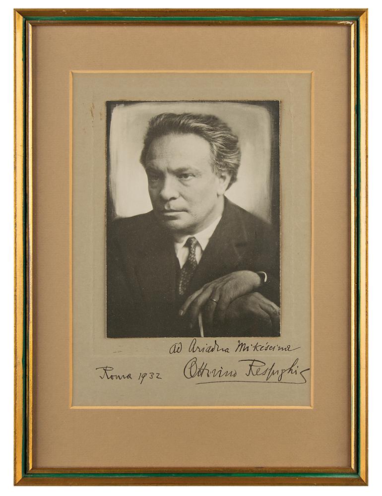 Italian violinist and composer (1879-1936) who is best remembered for his trilogy of orchestral tone poems Fountains of Rome, Pines of Rome, and Roman Festivals. Vintage matte-finish 6 x 8.5 portrait of Respighi, affixed to its original 8.5 x 12 mount, boldly signed and inscribed on the mount in fountain pen, "Au Ariadna Mikescime, Ottorino Respighi, Roma 1932.” Matted and framed to an overall size of 12.25 x 17. In fine condition.