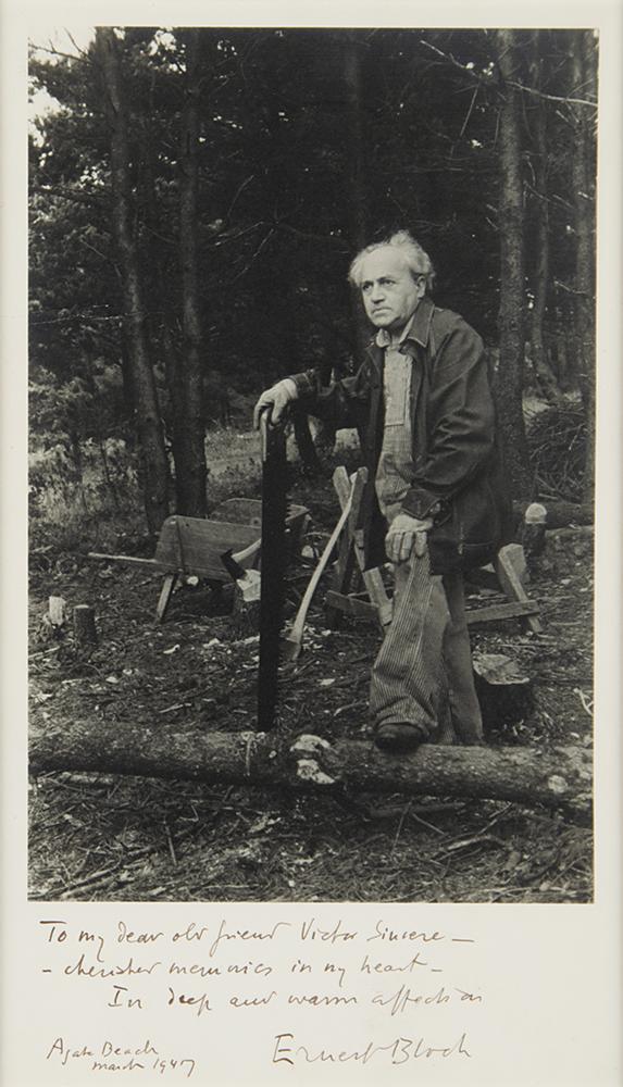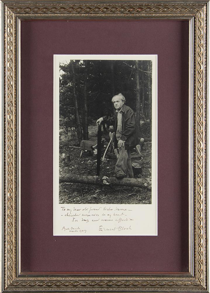 Swiss-born American composer (1880-1959) best known for his large-scale, often Jewish-inflected chamber, orchestral, and choral works. Vintage matte-finish 5.5 x 9.5 portrait of the composer in a full-length pose, signed and inscribed in fountain pen, "To my dear old friend Victor Sincere—cherished memories in my heart—In deep and warm affection, Ernest Bloch, Agate Beach, March 1947.” Matted and framed to an overall size of 11.25 x 15.5. In fine condition.