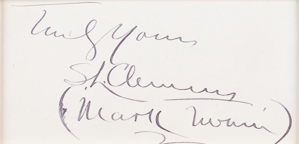 Fantastic fountain pen signature, "Truly yours, S. L. Clemens, (Mark Twain),” on an off-white 3.75 x 2 slip. Attractively double-matted and framed with a portrait of Clemens playing billiards to an overall size of 14.75 x 20.75. In fine condition. Accompanied by a full letter of authenticity from JSA. A great 'double' autograph using both his legal name and famous nom de plume.