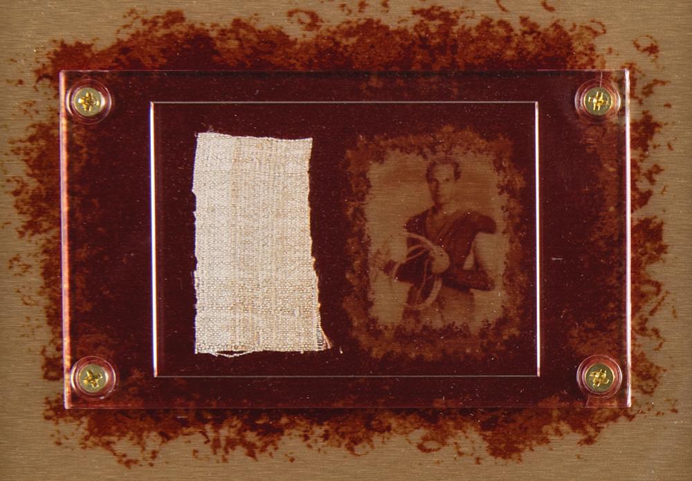 Fabric swatch, 1″ x 2″, from "the actual wardrobe worn by Charlton Heston as Judah Ben-Hur in the epic motion picture 'Ben-Hur.' The robe was obtained through the MGM Studios." Mounted to an explanatory plaque, double-matted with an image from the movie, and framed to an overall size of 18.5 x 22. In fine condition.