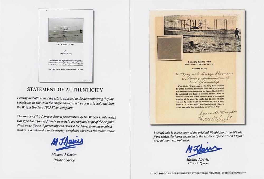 Tiny triangular swatch of fabric attributed to the original Wright Flyer, measuring approximately 1/4″ by 1/8″, applied to a 6 x 8 presentation photograph: "A relic from the first flight of the historic Wright Flyer. Constructed and flown by Orville and Wilbur Wright this was the first powered aircraft to achieve controlled flight." In fine condition. Accompanied by certificates of authenticity from Michael J. Davies of Historic Space, stating that the swatch was taken from an original presentation by the Wright family and depicting the certificate on which the fabric was originally mounted.