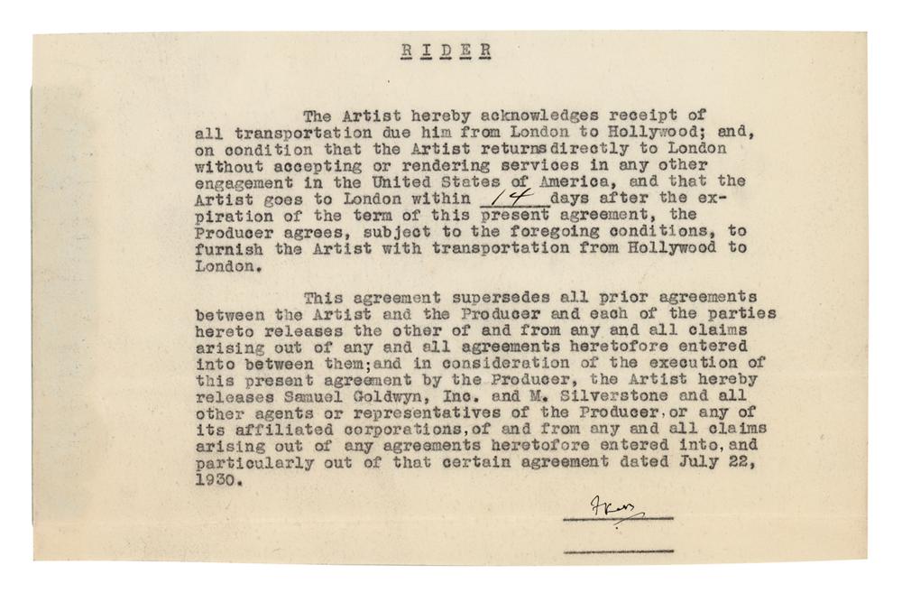 English actor (1858-1933) who played the Baron Frankenstein in the classic 1931 film Frankenstein. DS, signed “F. Kerr,” one page, 8.5 x 5.5, no date. Rider by which Kerr acknowledges "receipt of all transportation due him from London to Hollywood." In fine condition, with trimmed edges, and light show-through along the left edge from an old document remnant on the back.