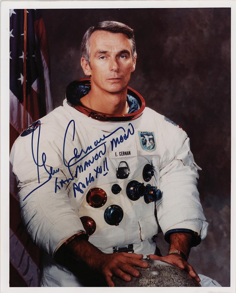 Color satin-finish 8 x 10 photo of the Apollo 17 commander in his white space suit, signed in blue felt tip, "Gene Cernan, Last Man on the Moon, Apollo XVII." In fine condition.