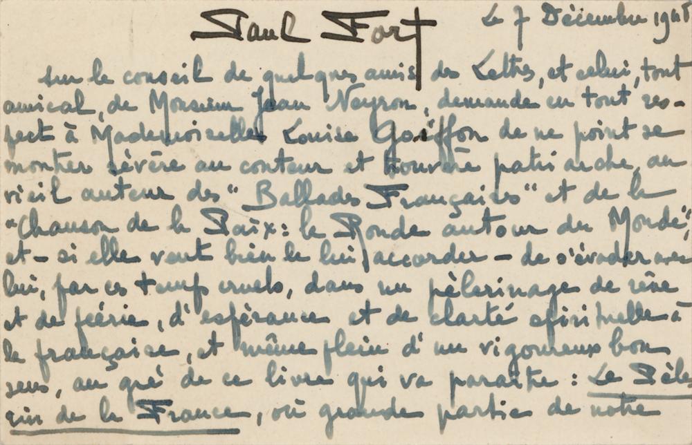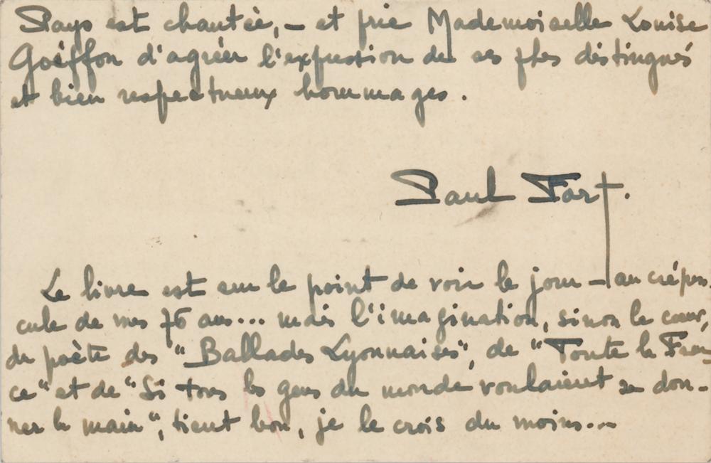 French poet associated with the Symbolist movement (1872-1960). ALS in French, one page both sides, 4.75 x 3, December 7, 1945. Untranslated handwritten letter by Paul Fort, signed at the head and at the conclusion. In fine condition.