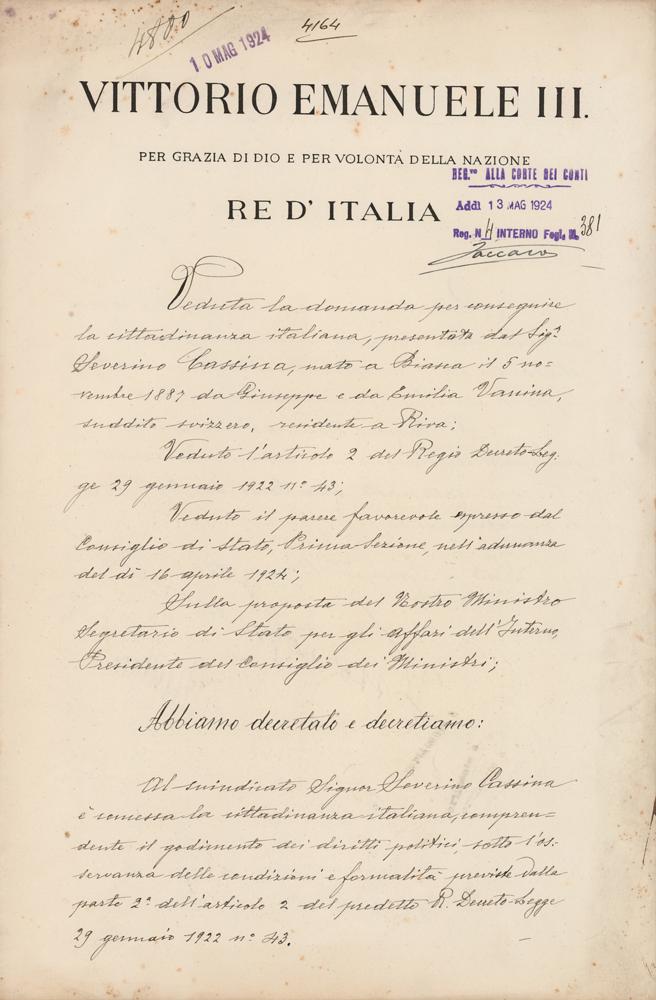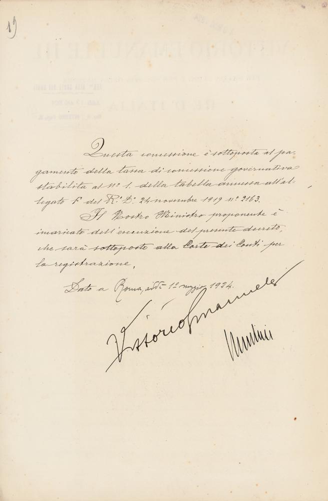 Manuscript DS in Italian, signed “Mussolini" and "Vittorio Emanuele,” one page, 9.75 x 15, May 1, 1924. Untranslated official document, boldly signed at the conclusion in ink by Benito Mussolini and Vittorio Emanuele III. In fine condition.