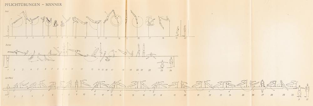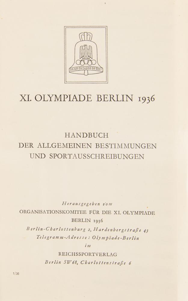 German-language book: XI Olympiade Berlin 1936 Handbuch der Allgemeinen Bestimmungen und Sportausschreibungen [Handbook of General Regulations and Sport Regulations]. Berlin: Reichssportverlag, 1936. Hardcover, 5 x 7.5, 332 pages. The detailed handbook offers the rules, regulations, and guidelines for the events of the Berlin 1936 Summer Olympics, and includes a number of fold-out charts, maps, and diagrams in the rear. In fine condition.