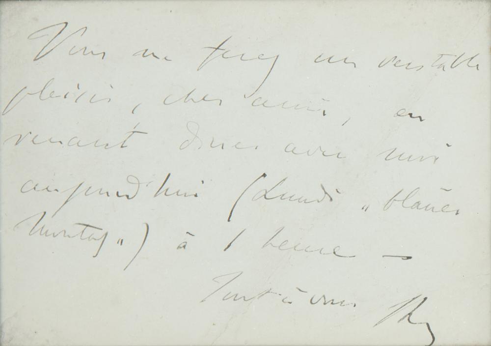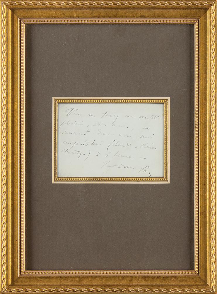 ANS in French, signed “F.L.,” one page, 4 x 2.75, no date. Untranslated handwritten note in French, penned on the reverse of a card bearing his facsimile signature. Matted and framed to an overall size of 8 x 11, with a window on the reverse for viewing the opposite side. In fine condition, with a light diagonal crease.