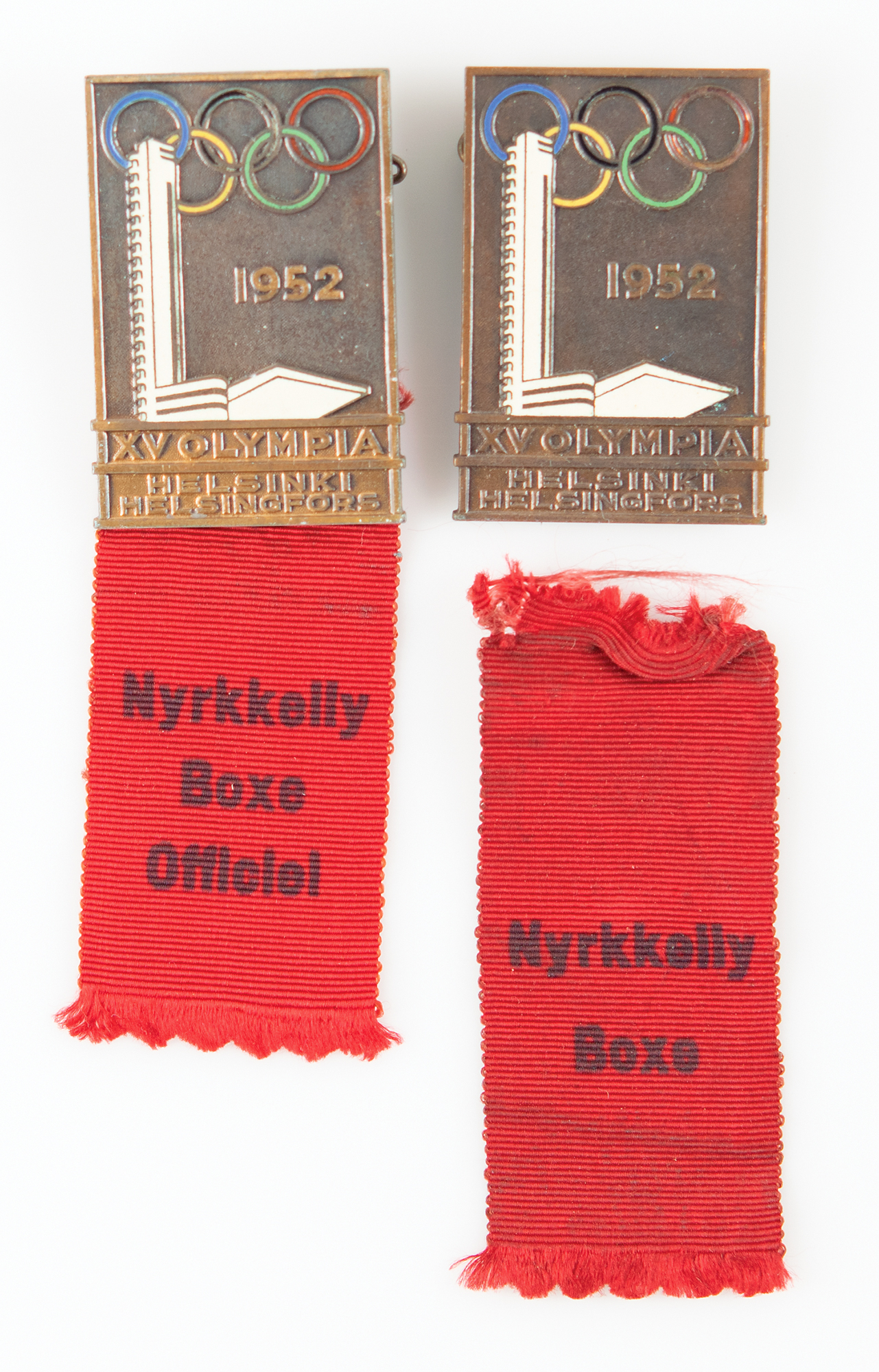 Desirable pairing of Helsinki 1952 Summer Olympics boxing official and competitor badges, measuring 33 mm x 48 mm, designed by Mainos-Taucher Ltd. in Finland and minted by Stabilimenti Artistici Fiorentini, Italy. The bronze badges feature a partially enameled design of the Helsinki Olympic stadium tower with rings and raised text, "1952, XV Olympia, Helsinki Helsingfors." Red ribbons below are marked "Nyrkkelly Boxe" and "Nyrkkelly Boxe Officiel."