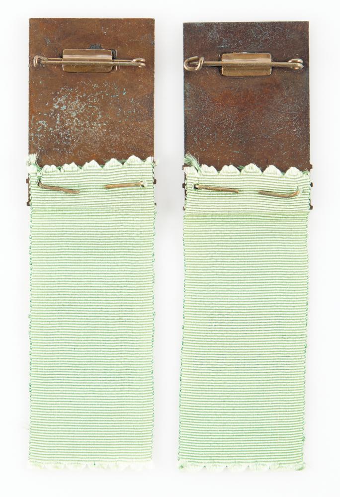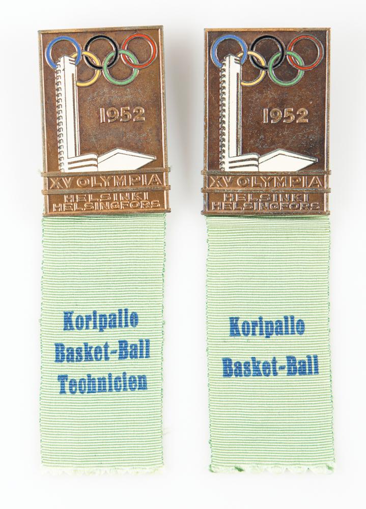 Sought-after pairing of Helsinki 1952 Summer Olympics basketball official and competitor badges, measuring 33 mm x 48 mm, designed by Mainos-Taucher Ltd. in Finland and minted by Stabilimenti Artistici Fiorentini, Italy. The bronze badges feature a partially enameled design of the Helsinki Olympic stadium tower with rings and raised text, "1952, XV Olympia, Helsinki Helsingfors." The light green ribbons are marked "Koripalle Basket-Ball" and "Koripalle Basket-Ball Technicien." The United States won gold in the Helsinki basketball tournament for the third consecutive Olympics.