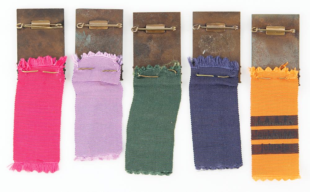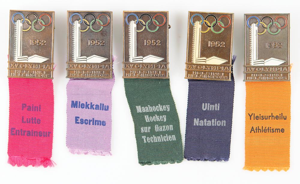 Group of five bronze badges issued for the Helsinki 1952 Summer Olympics, measuring 33 mm x 48 mm, designed by Mainos-Taucher Ltd. in Finland and minted by Stabilimenti Artistici Fiorentini, Italy. The bronze badges feature a partially enameled design of the Helsinki Olympic stadium tower with rings and raised text, "1952, XV Olympia, Helsinki Helsingfors." Multicolored ribbons suspended from each badge are marked with the event in French and Finnish: "Miekkallu Escrime" [Fencing], "Yleisurheilu Athletisme" [Athletics], "Paini Lutte Entaineur" [Wrestling], "Maahockey Hockey sur Gazon Technicien" [Field Hockey Technician], and "Uinti Natation" [Swimming].