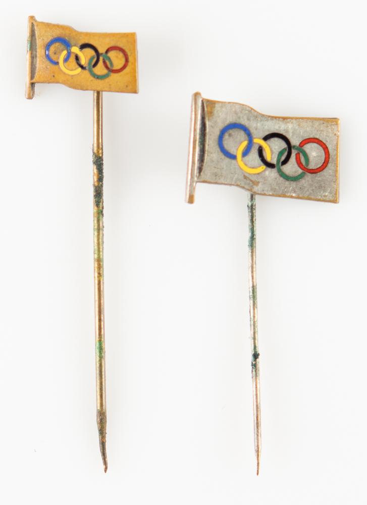 Two souvenir stickpins issued for the Berlin 1936 Summer Olympics, 20 mm x 15 mm and 15 mm x 10 mm, featuring the multicolored Olympic rings against a flag-shaped silver background.