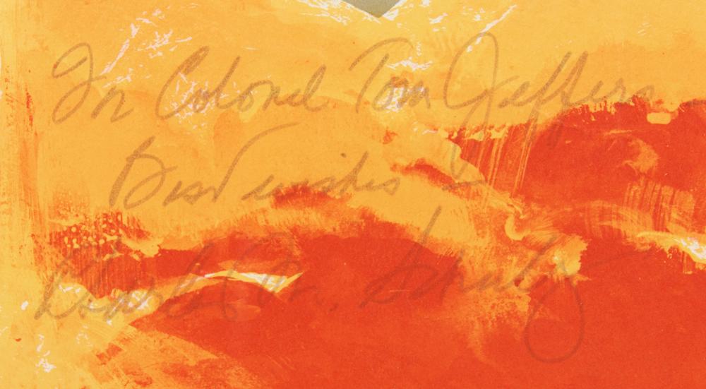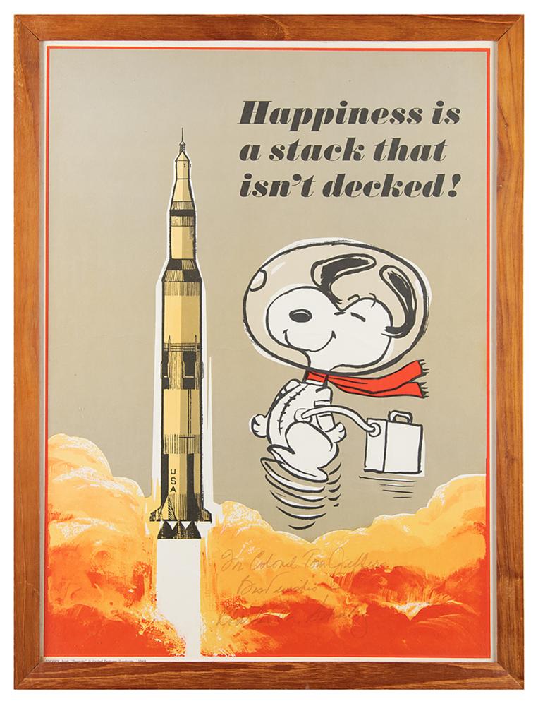 Scarce circa 1968 color 16.5 x 22.5 poster issued for the Apollo program, featuring an image of Astronaut Snoopy, the Saturn V rocket, and the text, "Happiness is a stack that isn't decked!," signed and inscribed in black felt tip, "For Colonel Tom Jeffers, Best wishes—Charles M. Schulz." Framed to an overall size of 18.5 x 24. In very good condition, with some creasing passing across Snoopy's image and the ink uniformly faded.