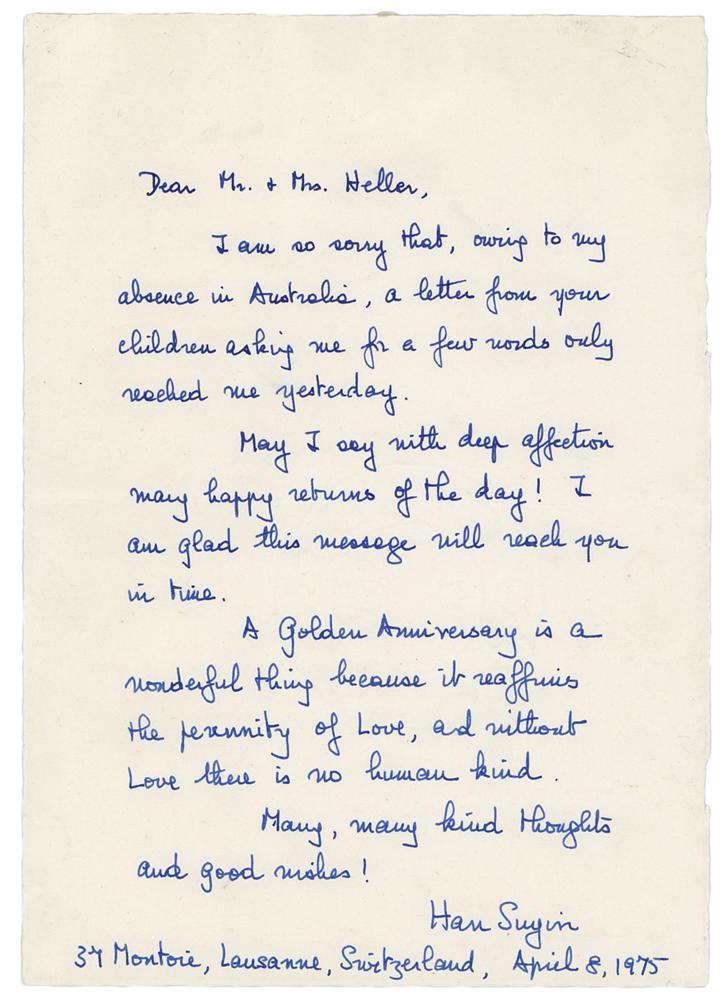 Pen name of Elizabeth Comber (1916-2012) whose novels and autobiographical memoirs covered the span of modern China, gaining her a reputation as an ardent and articulate supporter of the Chinese Communist revolution. ALS, one page, 5.75 x 8.25, April 8, 1975. Handwritten letter to Mr. and Mrs. Heller, in part: "I am so sorry that, owing to my absence in Australia, a letter from your children asking me for a few words only reached me yesterday. May I say with deep affection many happy returns of the day! I am glad this message will reach you in time. A Golden Anniversary is a wonderful thing because it reaffirms the perennity of Love, and without Love there is no human kind." In fine condition.