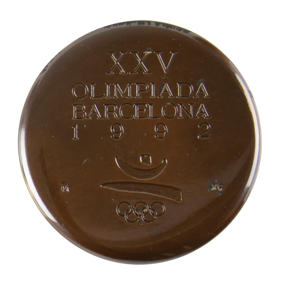 From the collection of longtime IOC member James Worrall—a participation medal issued for the 1992 Barcelona Summer Olympics. Burnished copper, 70 mm, 253 gm, by Xavier Corbero; manufactured by Fábrica Nacional de Moneda y Timbre. The front is engraved "XXV Olimpiada Barcelona 1992," with the Games logo of a stylized man leaping over the Olympic rings; the reverse bears an engraved spiral and elongated lightning bolt.