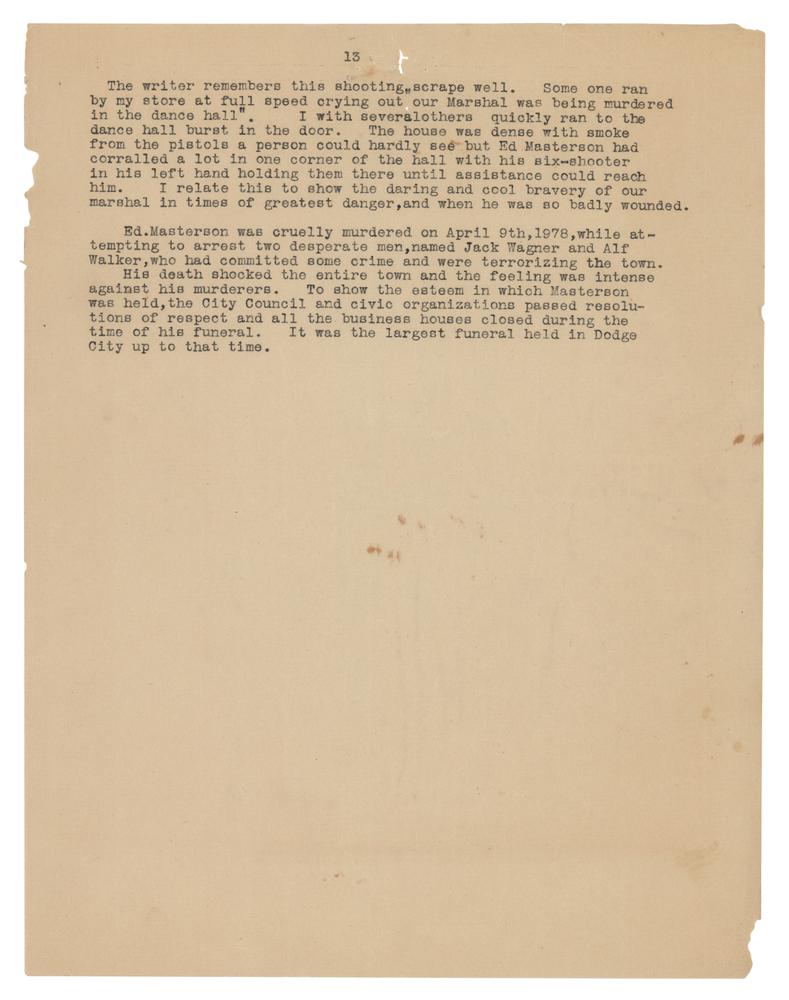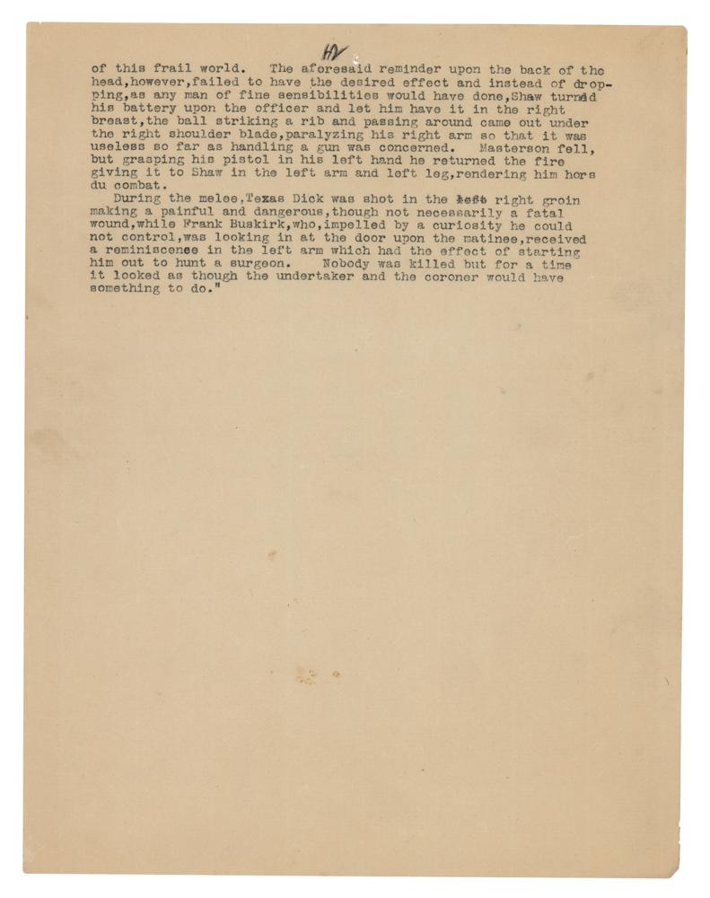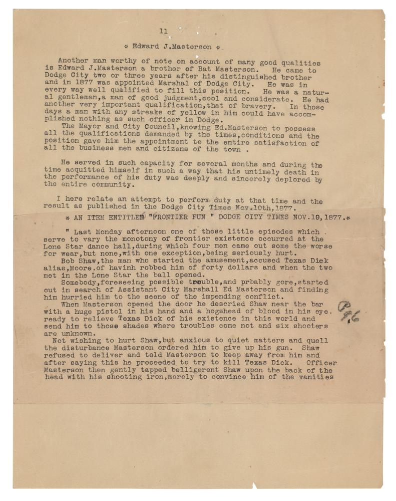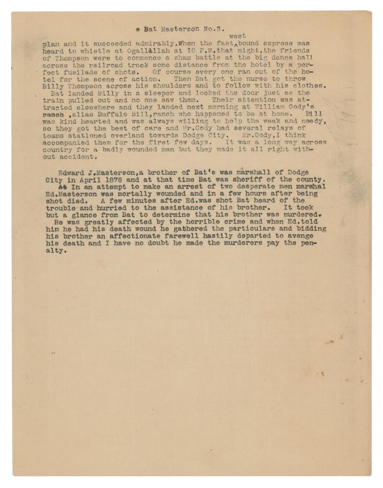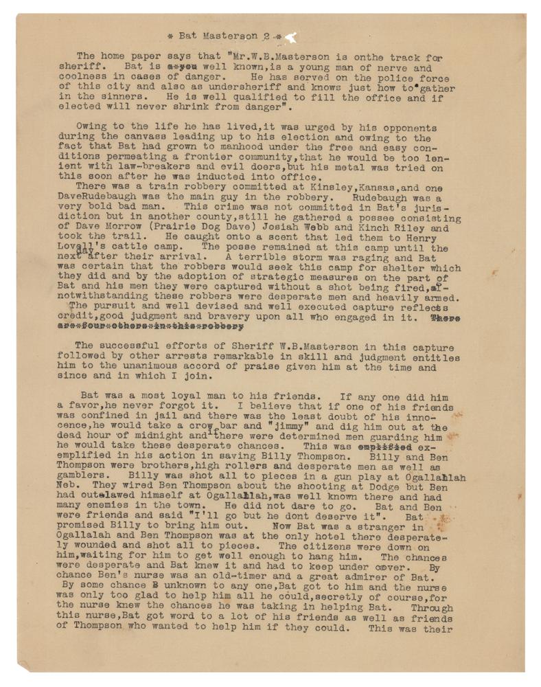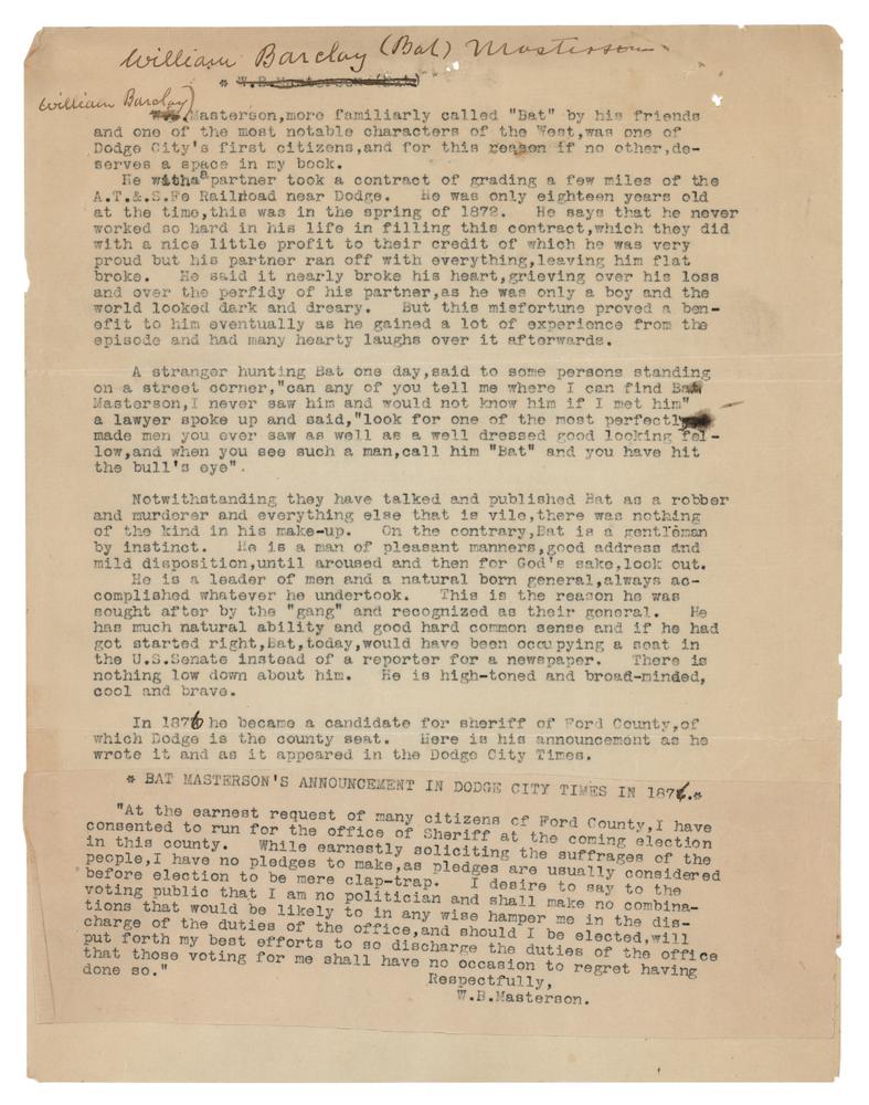 Army scout, lawman, professional gambler, and journalist (1853-1921) known for his exploits in the 19th and early 20th-century Old West; a good friend and associate of the legendary lawman Wyatt Earp in both Dodge City and Tombstone, Arizona. Remarkable hand-corrected typed manuscript, signed "Wiliam Barclay (Bat) Masterson," six pages bound at the head with a needle, 8.5 x 11, no date, with four ink corrections in Masterson's hand on the first page. Masterson amends the title, striking through 'W.B. Masterson (Bat)' and spelling out his full name in the upper margin, "Wiliam Barclay (Bat) Masterson," and changes the 'W.B.' beginning the piece to "William Barclay." He goes on to correct a date two times, changing the '7' in '1877' to a "6." This extraordinary document is a short biography of Masterson written by Robert M. Wright for his book Dodge City, The Cowboy Capital (1913). Wright, a former mayor of Dodge City, Kansas sent this manuscript to Masterson, a former deputy in Dodge City, for his review.