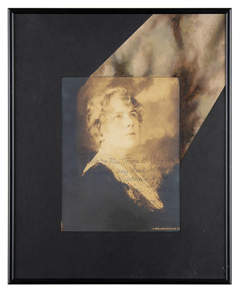 American operatic contralto who had an active international career (1871-1947, once praised by soprano Nellie Melba as 'the world's most beautiful voice.' Vintage matte-finish 7.25 x 9.5 head-and-shoulders photo of Horner looking skyward by G. Maillard Kesslere, signed and inscribed in fountain pen, "To Mr. and Mrs. Horace B. Clifton, With very kind regards, Sincerely yours, Louise Homer, 1927.” Matted and framed to an overall size of 13.5 x 16.75, with the mat embellished to appear as if casting a spotlight on the opera star. In fine condition.