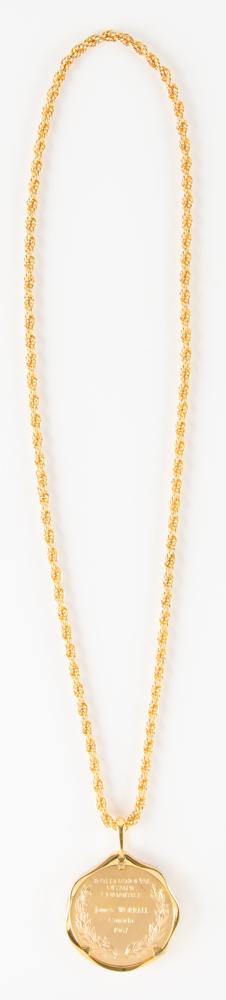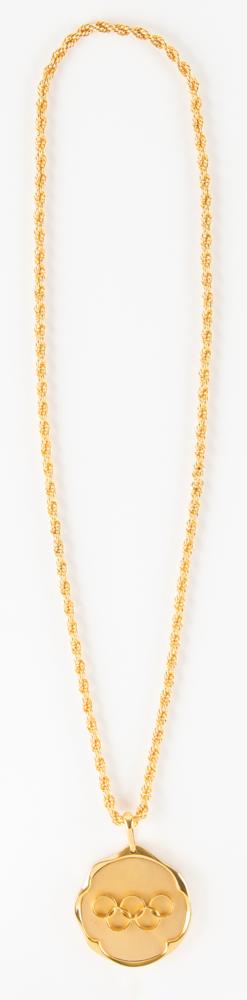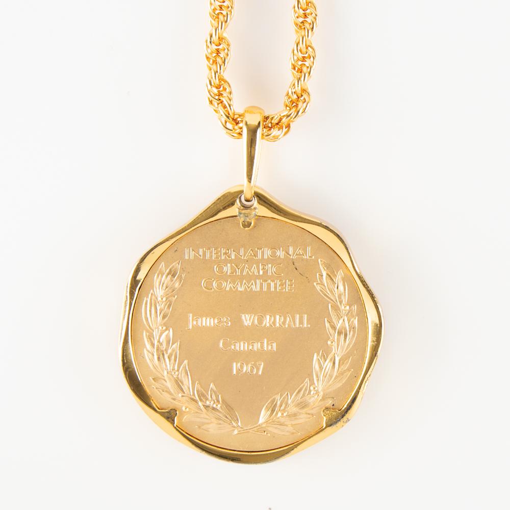 From the collection of longtime IOC member James Worrall—a rare gold-plated official International Olympic Committee honorary medal that was presented to Worrall in 1967. Silver, 57 mm, 85 gm (128 gm with chain), made by Argentfi, S.A., Barcelona. The scalloped-edged medal bears raised Olympic rings to the front and the reverse bears a laurel wreath and text in relief, “International Olympic Committee,” with a central engraving: “James Worrall, Canada, 1967.” Includes its original 15-inch gold chain, as well as its original black case with gilt Olympic rings on cover; the case bears extensive wear and material loss to the exterior.