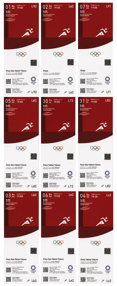 Set of nine original 3 x 7.75 full tickets for the track and field events of the Tokyo 2020 Summer Olympics, with three identified as "Press Tabled Tribune," four as "Press Non-Tabled Tribune," and two as "Photo." As there were no spectators and ticket brokers returned their supply, the only Tokyo tickets officially issued were for press or media. Only a few sports, which had limited seating or photo positions, required media tickets and these were scanned at the entrance. In mint condition.