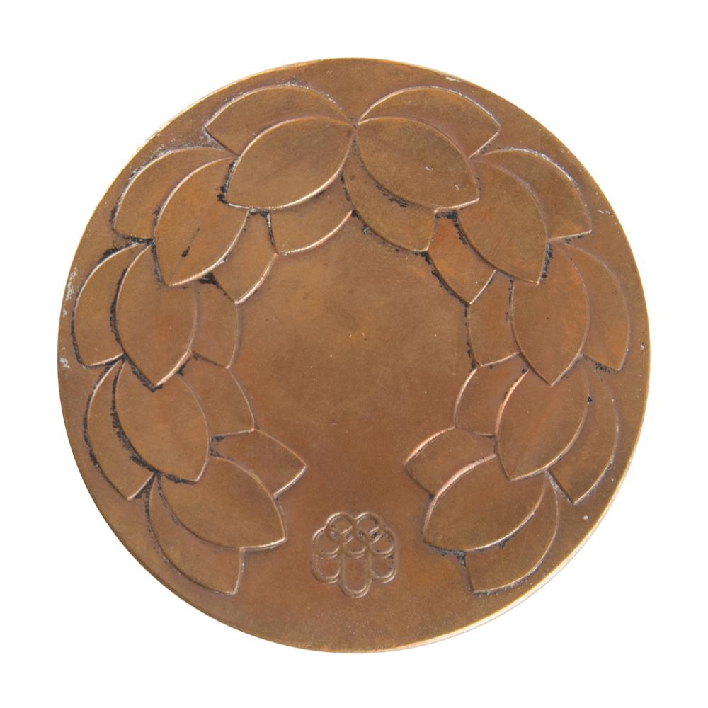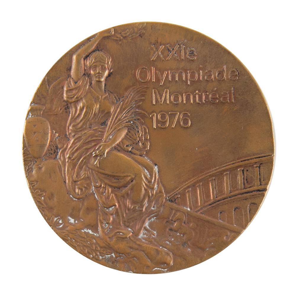 Unawarded winner's medal issued for the Montreal 1976 Summer Olympics. Bronze, 60 mm, 124 gm, by Giuseppe Cassioli, Ottawa. The front, inscribed, "XXIe Olympiade Montreal 1976," features a 'Seated Victory' with the Coliseum in the background; the reverse features the Montreal Olympic emblem and victor's laurel wreath. The edge, which would normally feature the engraved name of the event, remains blank, and its chain is missing. A desirable third-place prize medal from the first Canadian Olympiad.