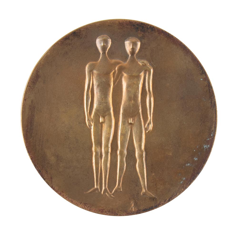 Unawarded winner's medal issued for the Munich 1972 Summer Olympics. Bronze, 66 mm, 130 gm, designed by Gerhard Marcks and manufactured by the Bavarian Mint. The front is inscribed, “XX. Olympiade Munchen 1972,” and depicts the 'Seated Victory' with the Colosseum in the background; the reverse portrays the mythological twins Castor and Pollux, the patrons of competitive sport and friendship, with the artist's monogram below. The edge, which would normally feature the engraved name of the event, remains blank, and its chain is missing. Exhibits some light overall wear and tarnishing. This was the first winner's medal since 1928 to feature a new design on the reverse, replacing the traditional depiction of a victorious athlete carried by a jubilant crowd.